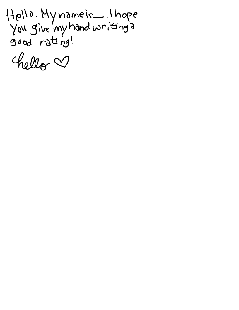 The handwriting is large and upright, with a rounded style. The letter formations are simple and clear, as seen in words like "Hello" and "rating". There is a slight variability in letter size and spacing, and the handwriting appears somewhat childlike, and written with a degree of enthusiasm. The heart shape is an obvious and clear indicator of optimism and cheerfulness.