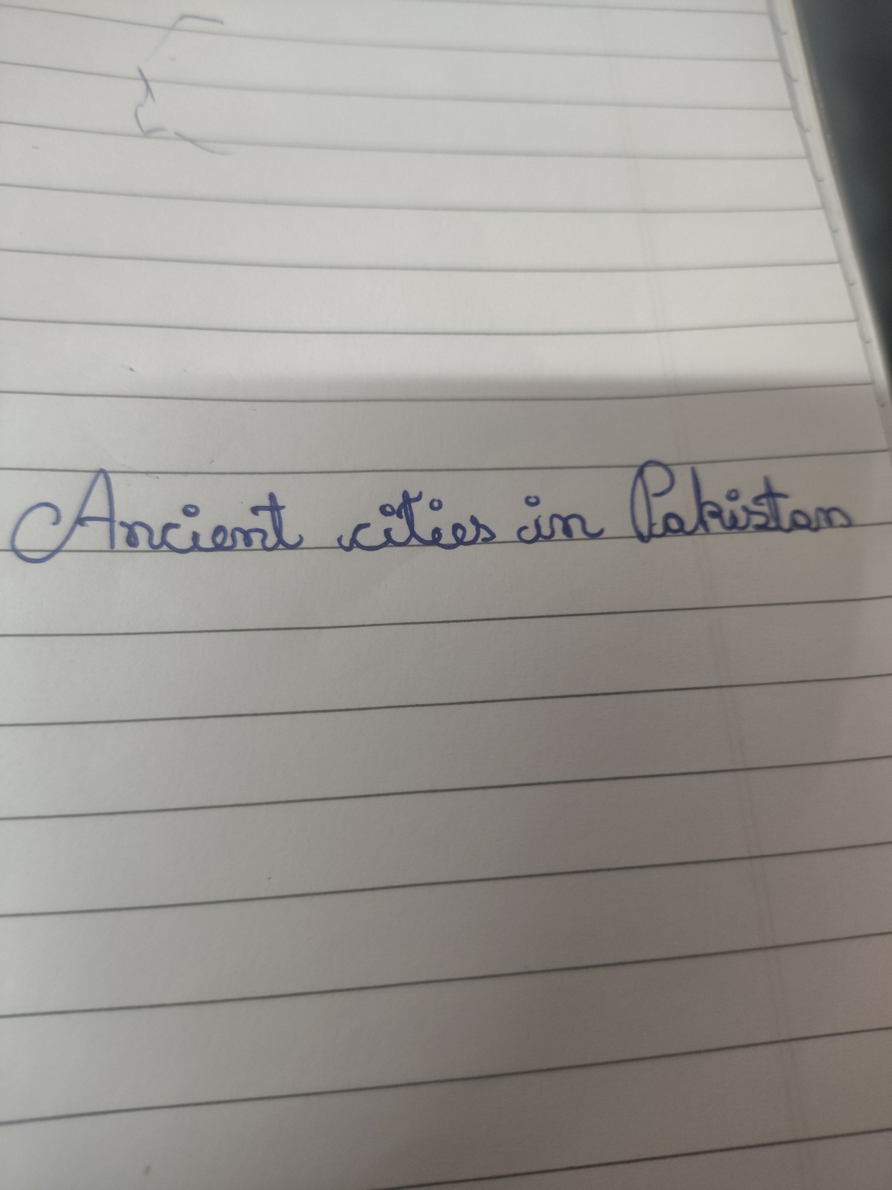 The handwriting in this sample displays a cursive style with rounded letter formations, as seen in the words "Ancient" and "Pakistan." The letters are generally connected, suggesting a fluid writing motion. The size of the letters appears consistent, indicating a controlled hand. Overall, the handwriting is quite legible and neatly presented, aligning well with the lines of the paper.