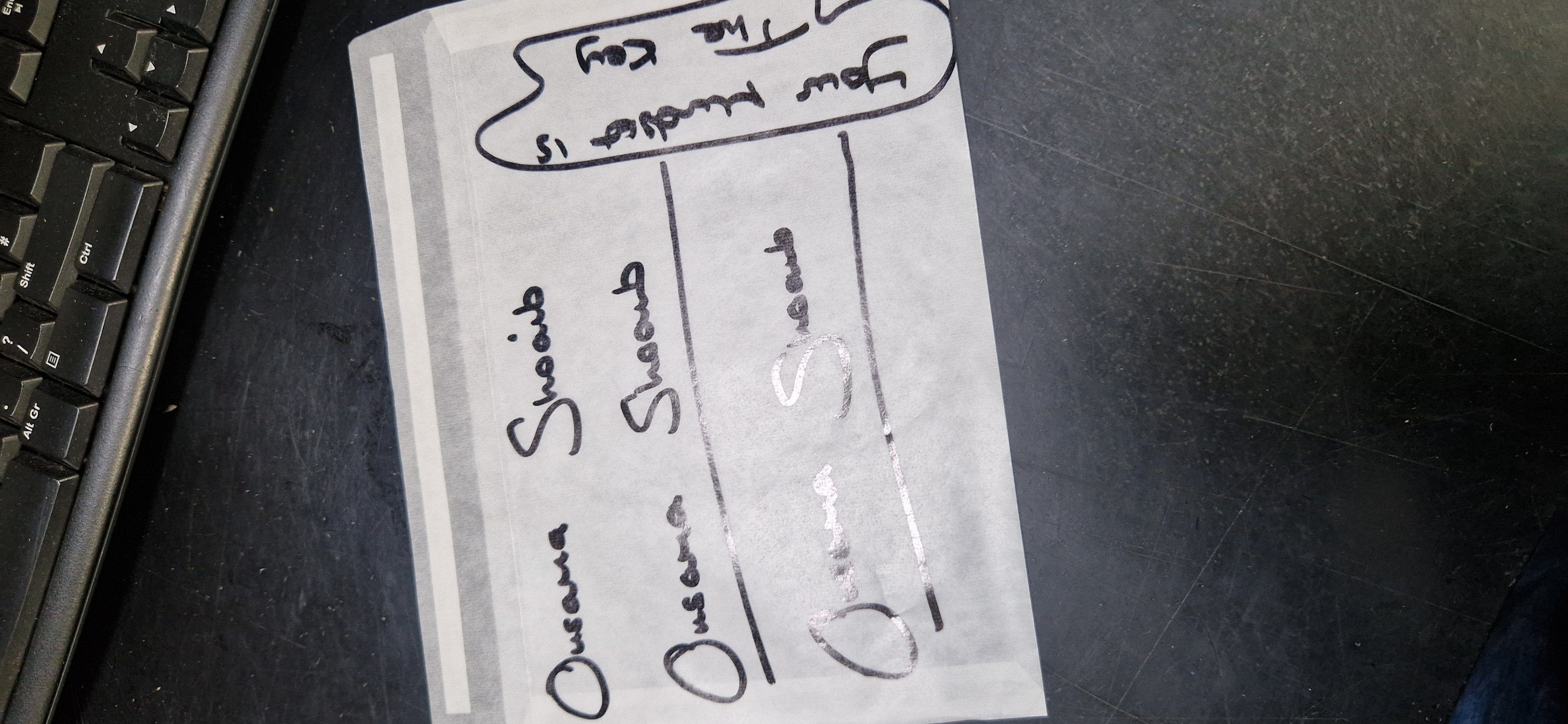 The handwriting in this sample exhibits a mixture of careful formation and a somewhat hurried execution. The letter forms, particularly in the names "Ousama" and "Shoaib", are generally rounded and full, suggesting a desire for clarity and legibility. However, there's a slight inconsistency in the stroke weight and letter spacing, which gives the impression that the writer might have been working quickly or under some time constraint. The phrase "Your Mother is The Key" is written with more deliberate strokes, and the use of a distinct, enclosed shape around the phrase indicates a desire to emphasize the message.