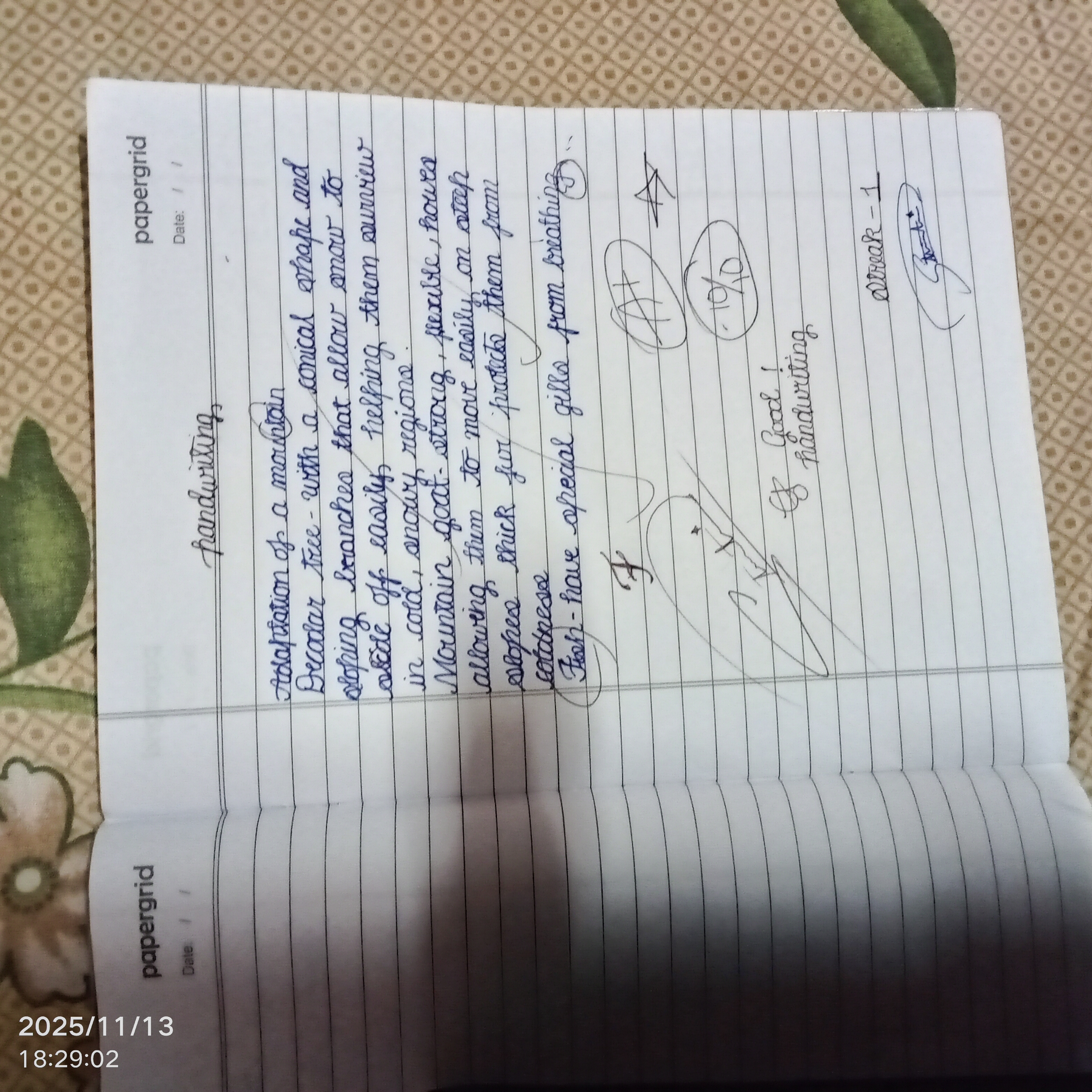 The handwriting presents a consistent slant to the right, with rounded letterforms that suggest a flowing and connected style. The size is fairly uniform, contributing to the overall neatness. The 'mountain goat' and 'allowing them' show the connections within words. While the handwriting is generally legible, some words, like 'Decodar tree', could benefit from clearer letter formation to enhance readability.