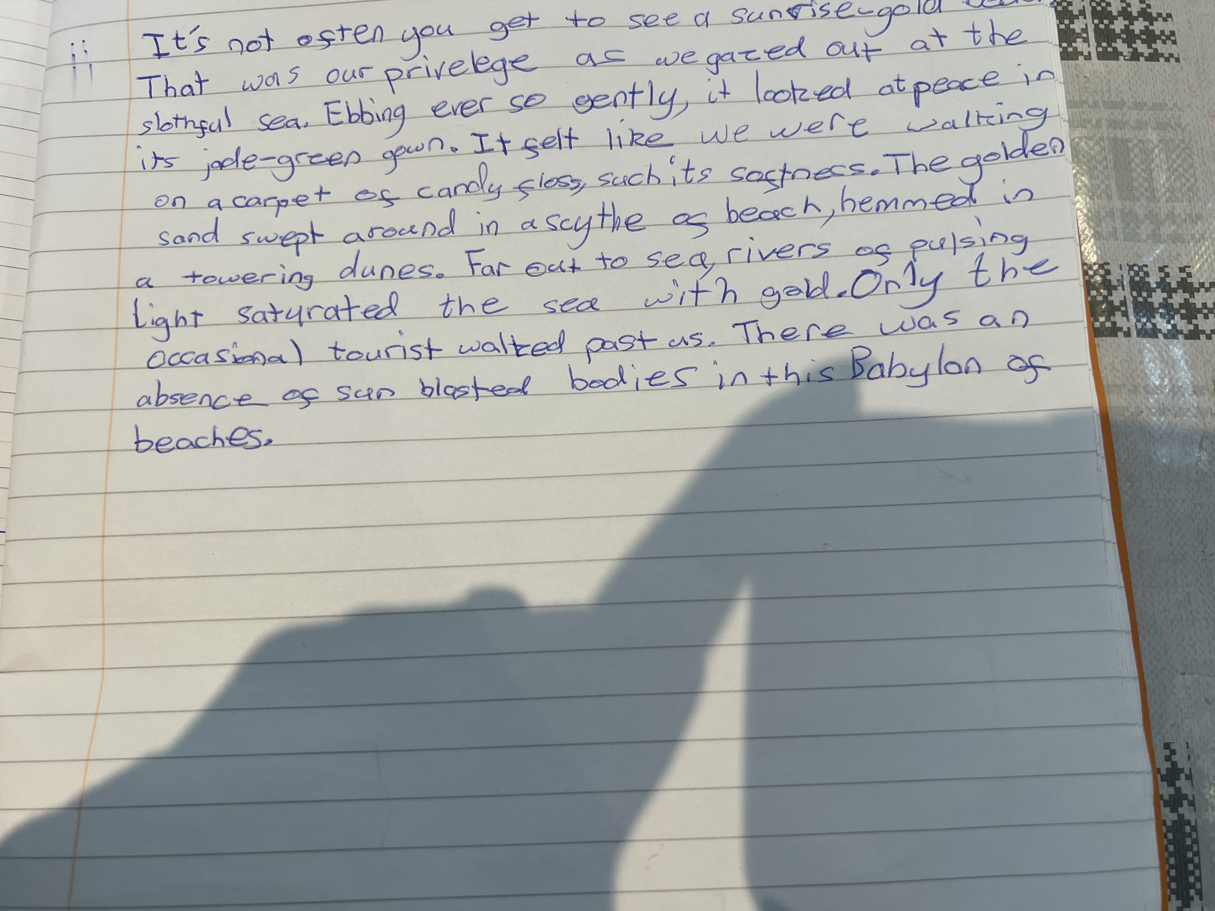 Based on this handwriting, you appear to be a person who values tranquility and has a contemplative nature. The overall relaxed and unhurried style hints at patience and a capacity for introspection. The artistic turn of phrase, like 'sunrise-gold beach' and 'jade-green gown', indicates a creative and imaginative mind. The slight inconsistencies suggest a personality that is not overly rigid, embracing a touch of whimsy.