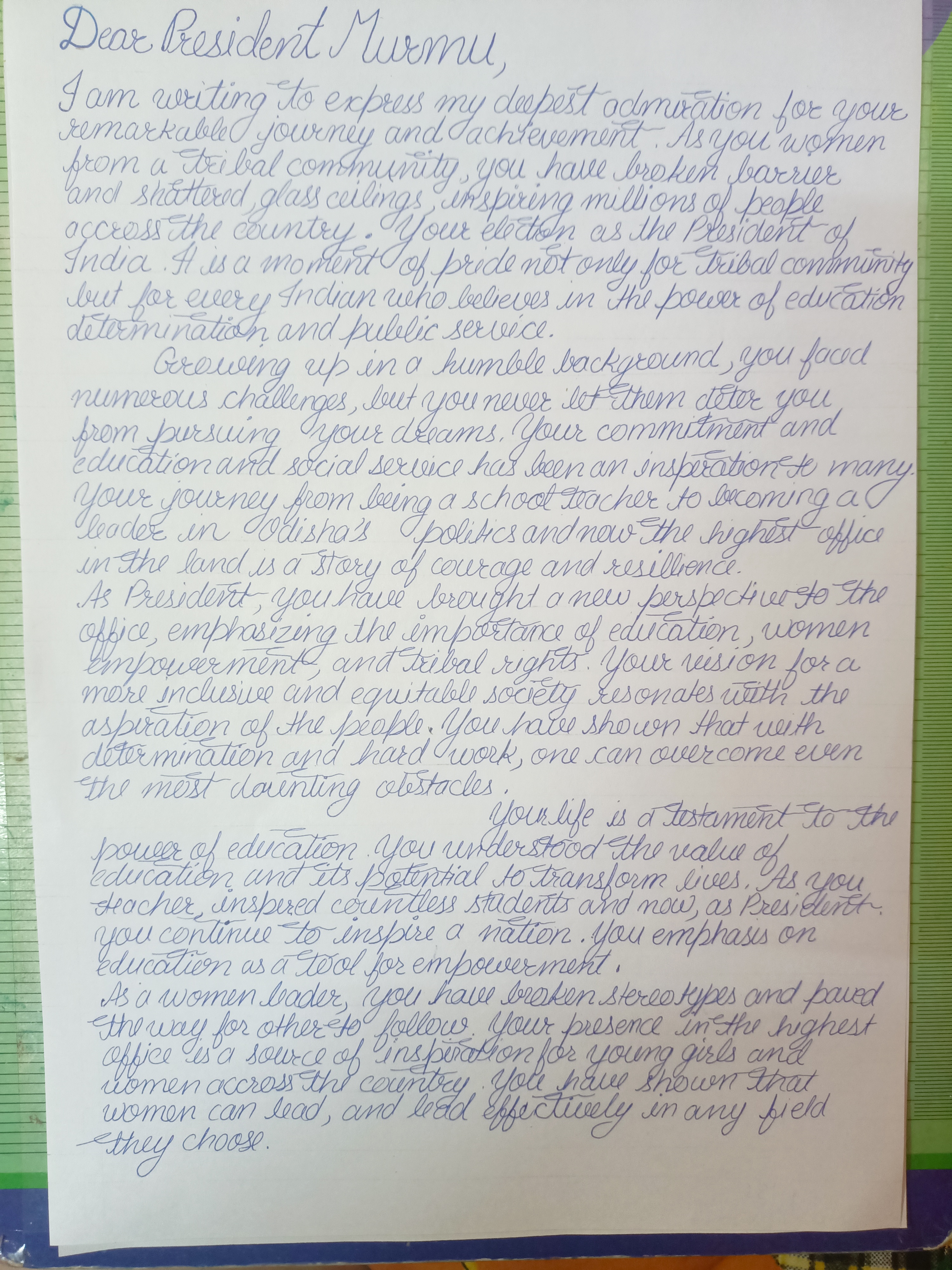 The handwriting is characterized by its flowing, cursive style with elegantly looped ascenders and descenders, as seen in words like "Murmu" and "journey". The script exhibits a consistent slant and pressure, contributing to an overall sense of rhythm and balance. The letter formations are rounded and connected, giving the writing a graceful appearance. There's a notable emphasis on clarity, even within the cursive flow, ensuring the text remains relatively legible, though some words, such as "obstacles", show some inconsistent spacing.