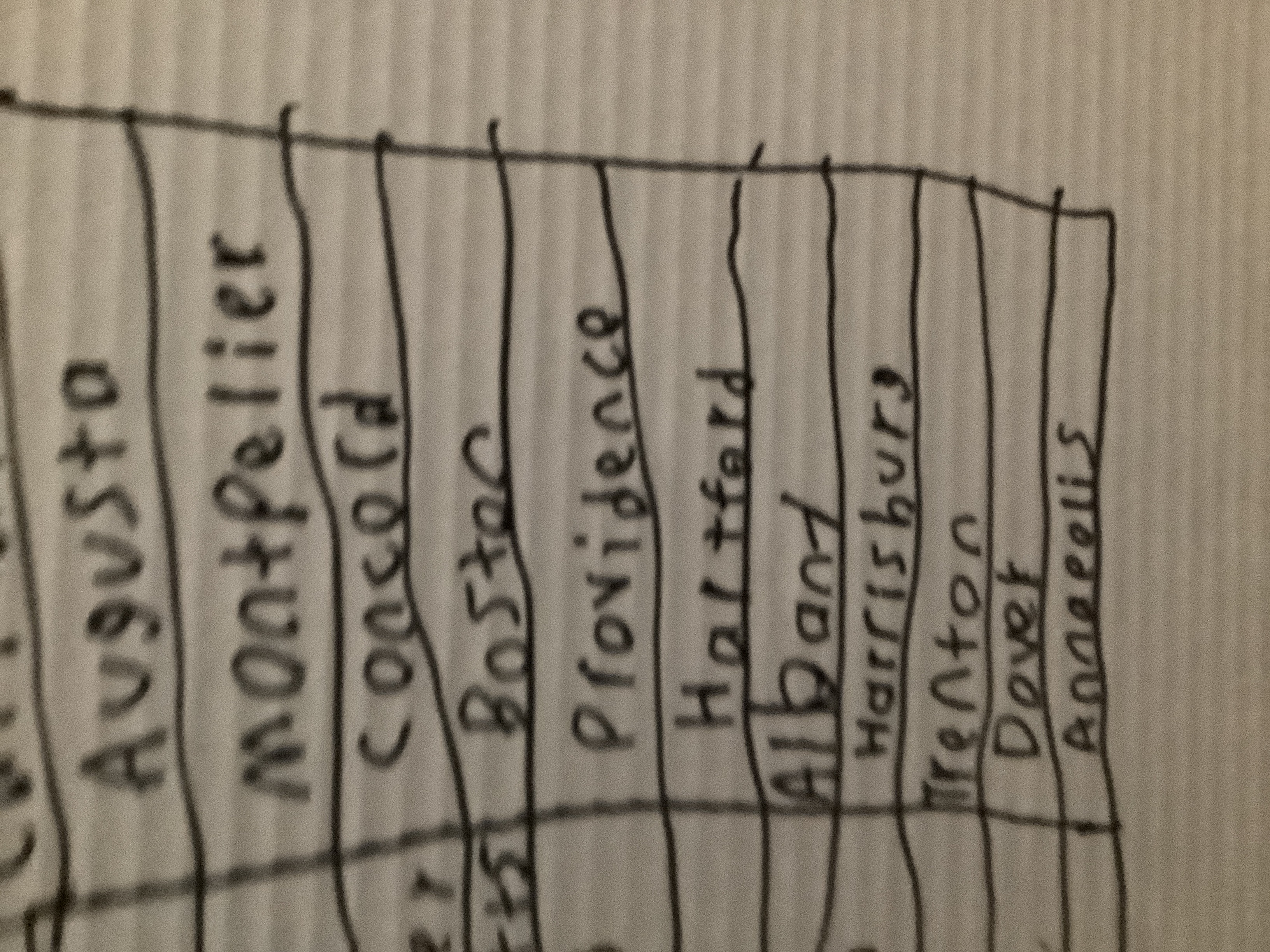 The handwriting style presented here is characterized by its upright stance and blocky letter formations. The letters appear to be formed with a deliberate, perhaps even painstaking, approach. Notice how the letters in words like "Montpelier" and "Providence" maintain a fairly consistent size, although the spacing between them can vary. The general impression is one of careful execution, albeit with a certain lack of fluidity.