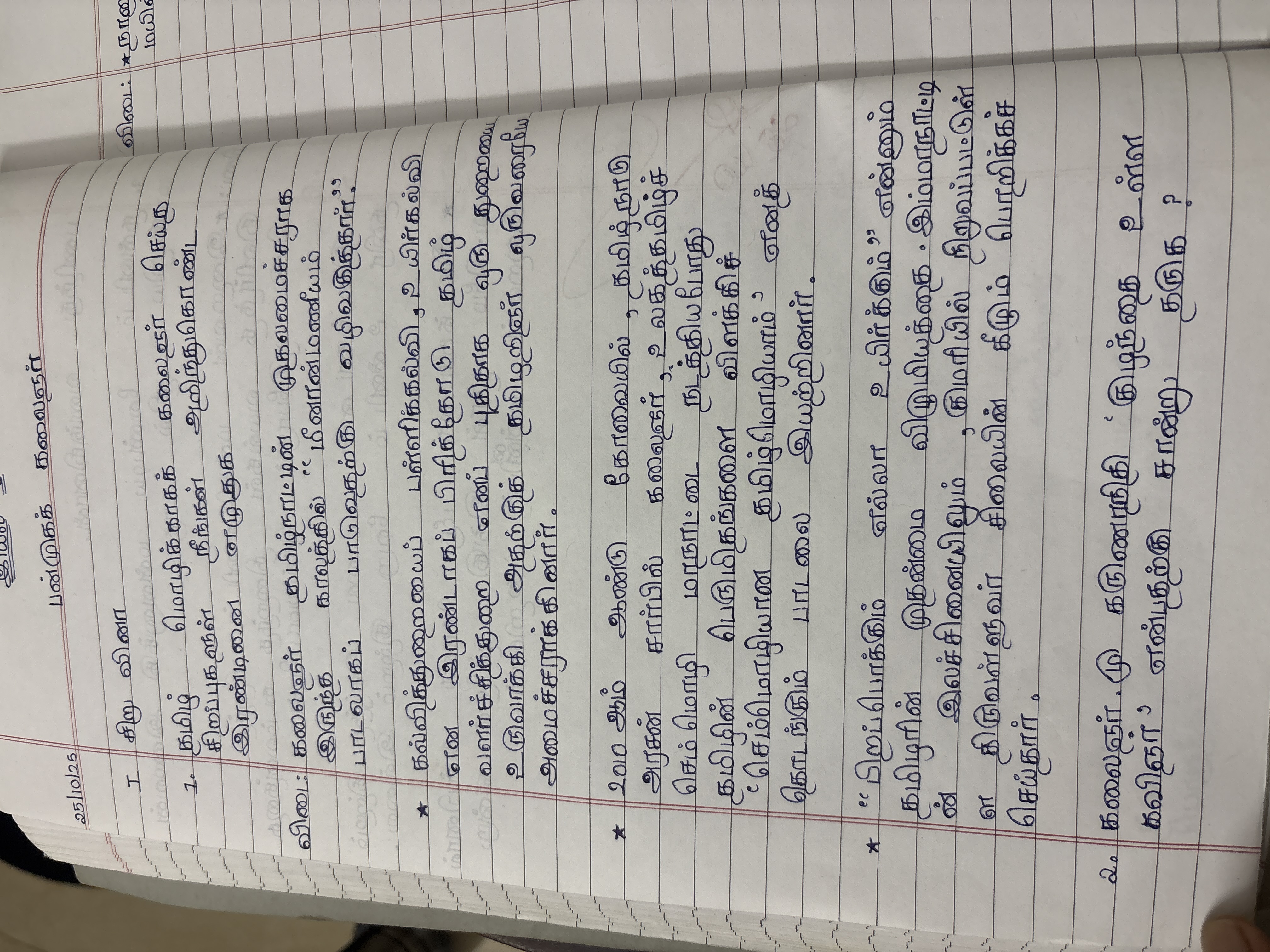The handwriting is characterized by a clear, upright style, as seen in the consistent verticality of letters like 'தமிழ்' and 'கலைஞர்'. The script flows smoothly, indicating a good level of writing proficiency. The letterforms are generally well-proportioned, with consistent sizing contributing to overall legibility. There is a distinct loop on letters like 'ழ', 'க', and 'க', which lends the writing a unique flourish. The pressure applied seems even, suggesting a steady hand and focused attention. Overall, the writing is neat and easy to read.