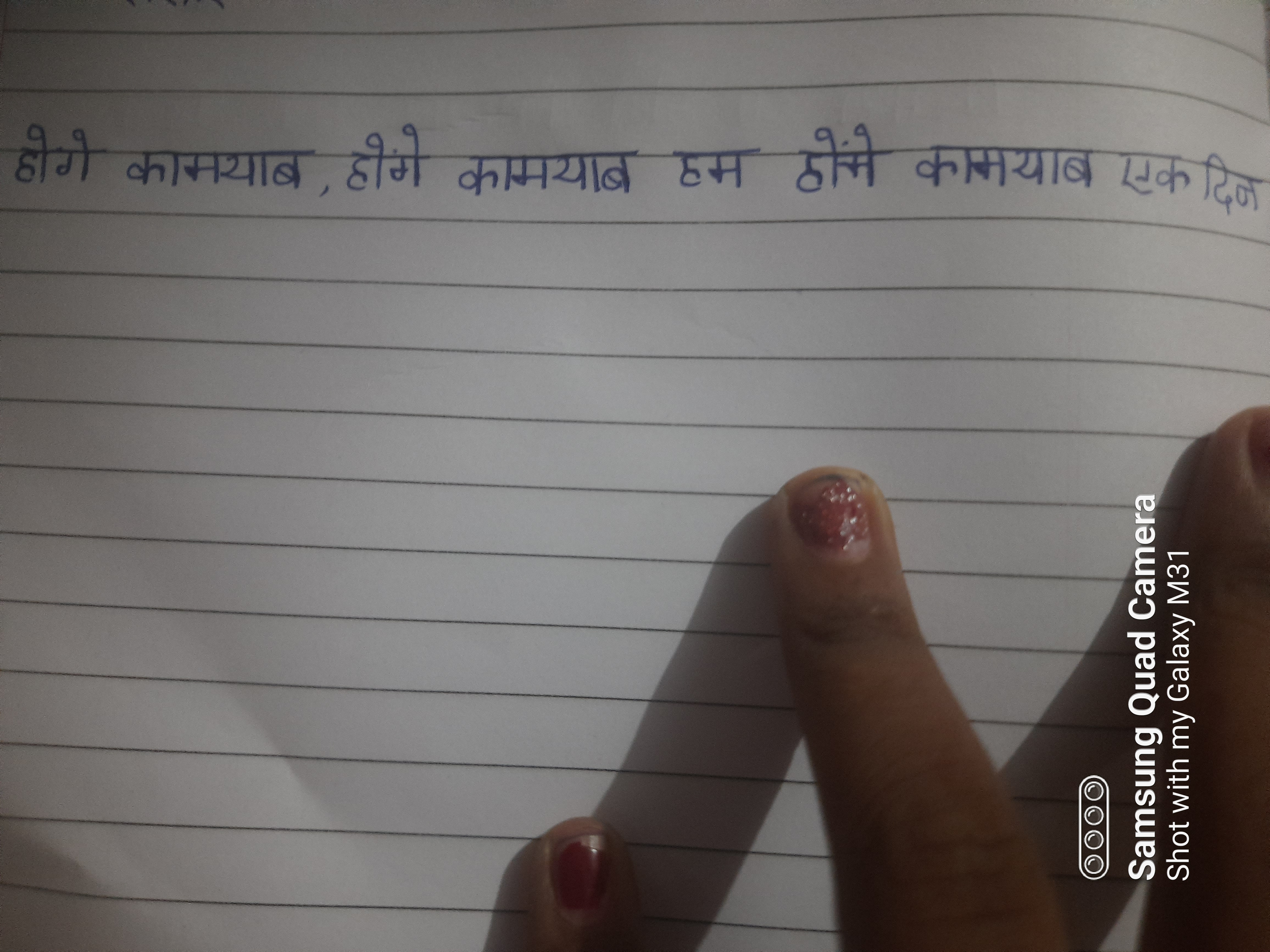 The handwriting exhibits a deliberate and careful style. The letters are well-formed and clearly separated, demonstrating attention to detail. The spacing between words is consistent, enhancing readability. The phrase "होंगे कामयाब" is repeated with remarkable uniformity, indicating a disciplined approach to writing.