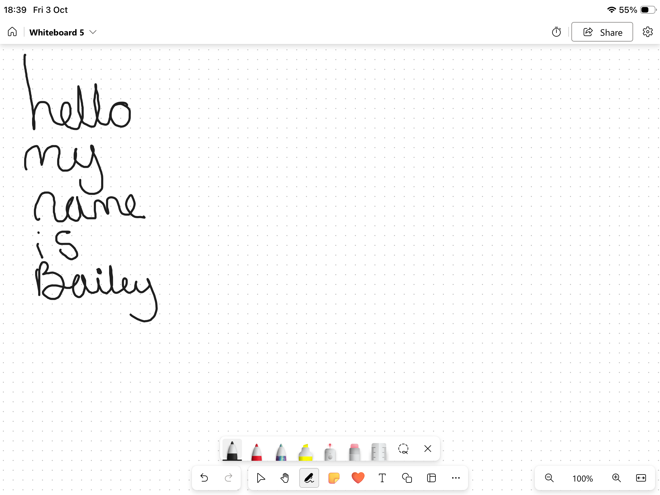 This handwriting leans towards a rounded and loopy style, evident in letters like 'h', 'y', 'g', and especially in the full curves of 'Bailey'. There's a gentle slant and a relatively light pressure, giving the overall impression of ease and fluidity. However, the size of the letters varies somewhat, with some appearing larger and more prominent than others, suggesting a certain spontaneity. The 'r' in 'name' is somewhat ambiguous, and the dot on the 'i' in 'is' is very light.