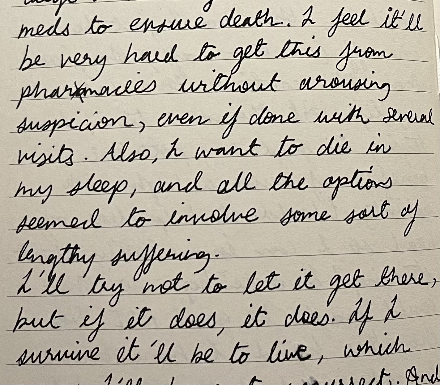 This handwriting is characterized by its consistent slant and cursive style. The loops in letters like 'l' and 'g' are elongated, adding a touch of elegance. The pressure appears relatively uniform, and the baseline is generally followed, though there are some slight undulations. Words like 'pharmacies' and 'suspicion' demonstrate a connected flow, while others show a slight separation, suggesting a blend of fluidity and deliberation.