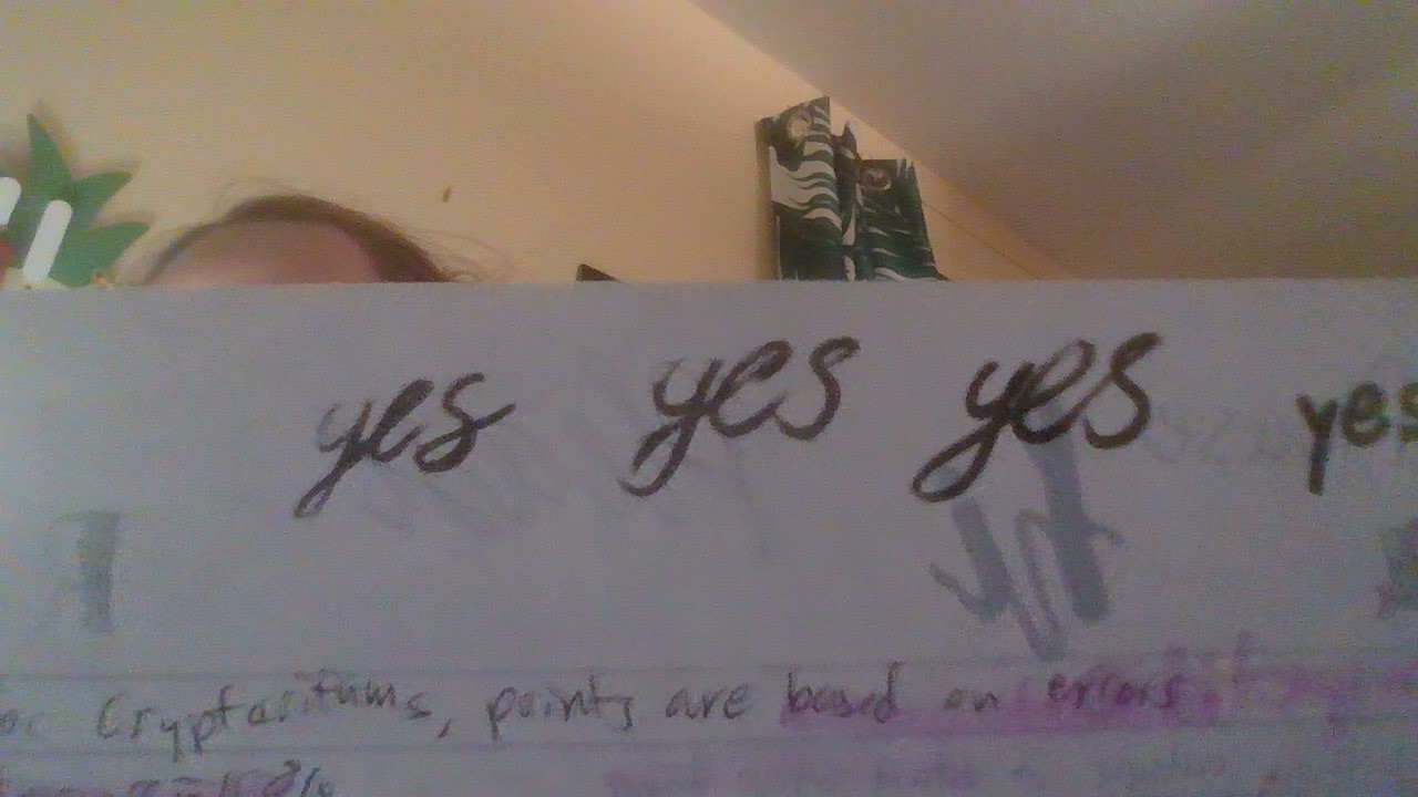 Based on this handwriting, the individual might be someone who is generally optimistic and agreeable, as evidenced by the repeated affirmation. The rounded letter forms and the looping style suggest a person who is creative and perhaps a bit impulsive. The rightward slant often indicates a desire for connection and engagement with others, while the fluctuating baseline may point to adaptability and emotional expressiveness.