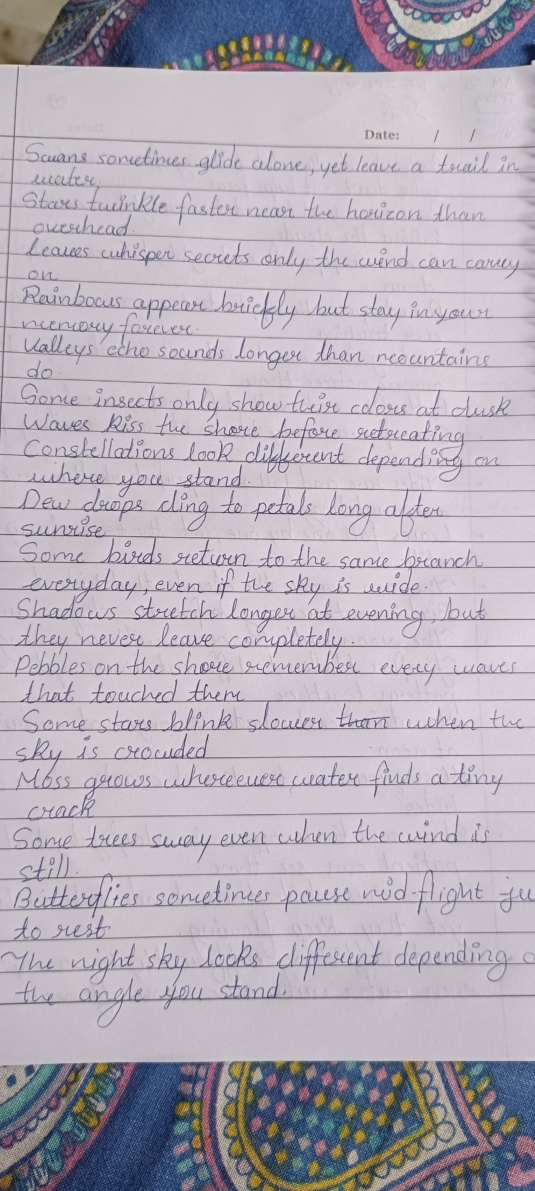 This handwriting suggests a personality that values harmony and beauty. The rounded letterforms hint at approachability and empathy, while the consistent slant reveals a degree of determination. The slight inconsistency could indicate a free spirit, one who appreciates spontaneity and doesn't always adhere to rigid structures. The writer is likely someone who enjoys contemplation and finds solace in nature, as reflected in the poetic and evocative choice of words.