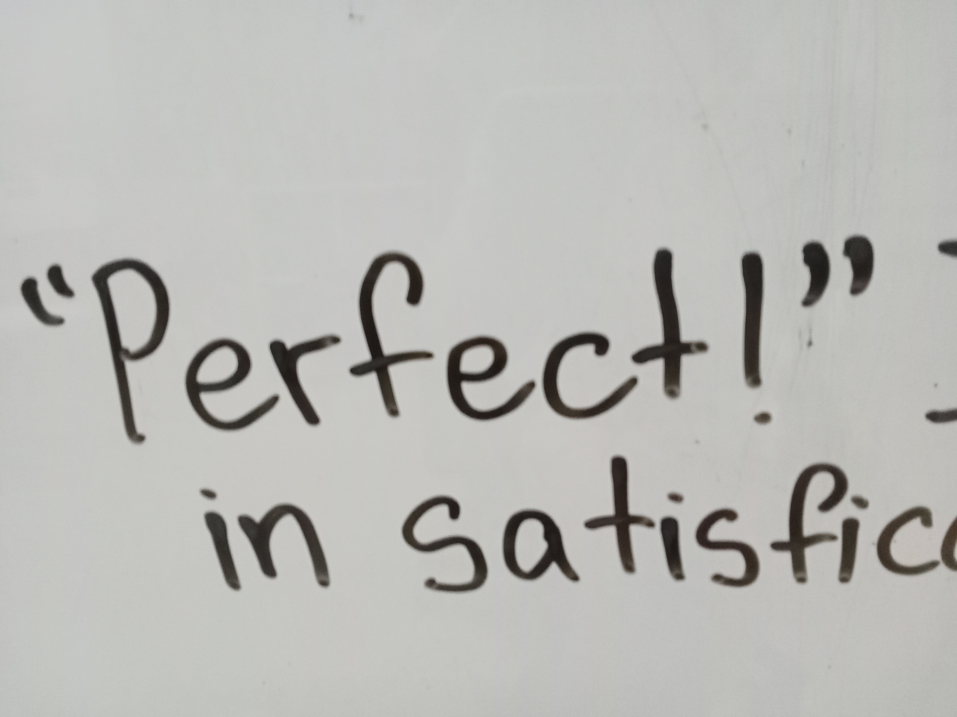 The handwriting style presented is characterized by rounded, almost childlike letter formations, evident in words like "Perfect!" and "satisfice". The strokes are bold and firm, indicating a confident hand. The overall appearance suggests a deliberate and somewhat playful approach to writing, although consistency is a bit variable, with some letters appearing more carefully formed than others.