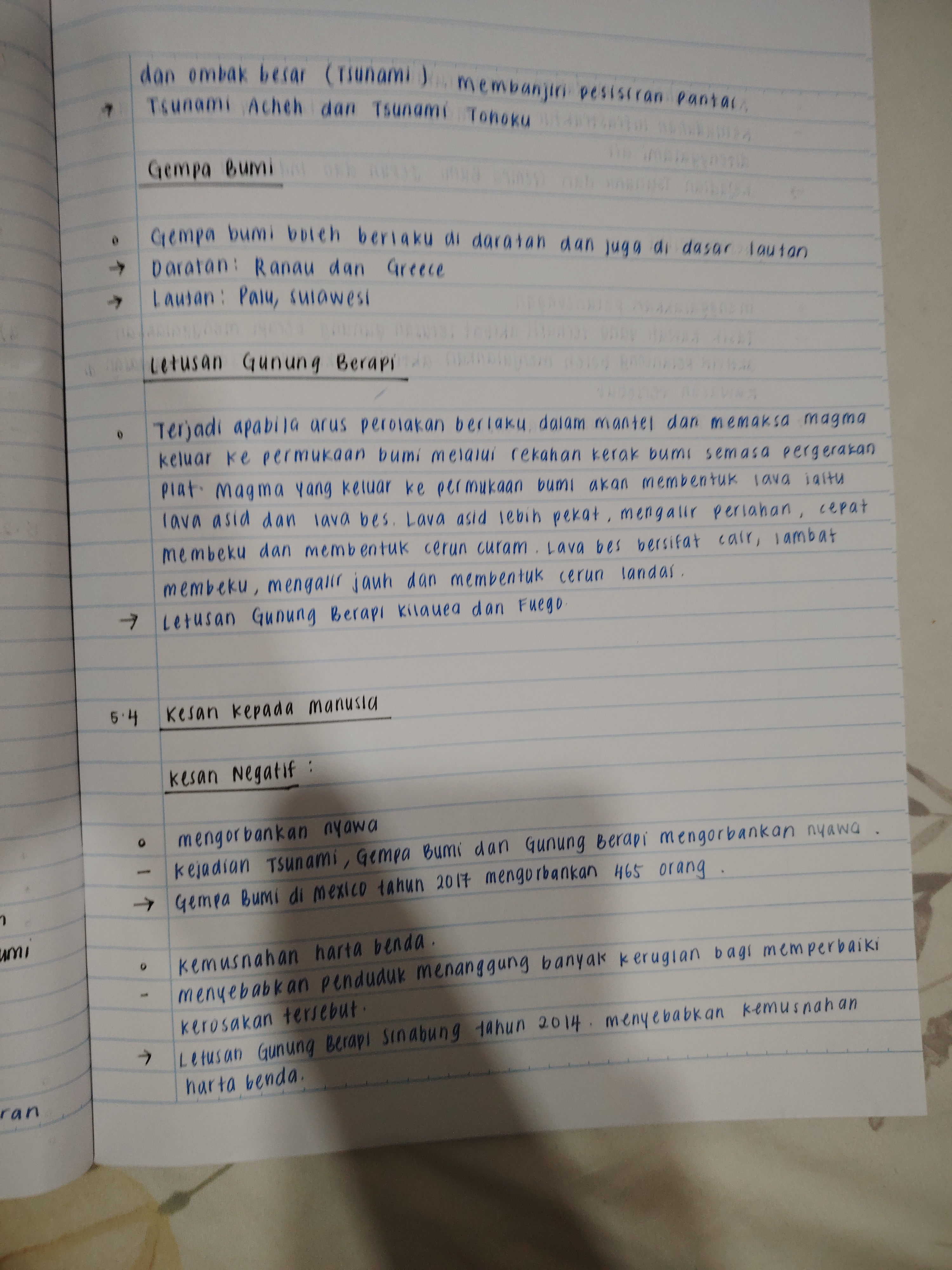 The handwriting is neat and upright, displaying a generally consistent slant. The letter formations are clear, although there's a slight variation in size and spacing between words. The pressure applied is moderate, suggesting a balanced approach. The overall impression is that of careful, considered writing, as exemplified in the words "Tsunami Acheh dan Tsunami Tohoku".