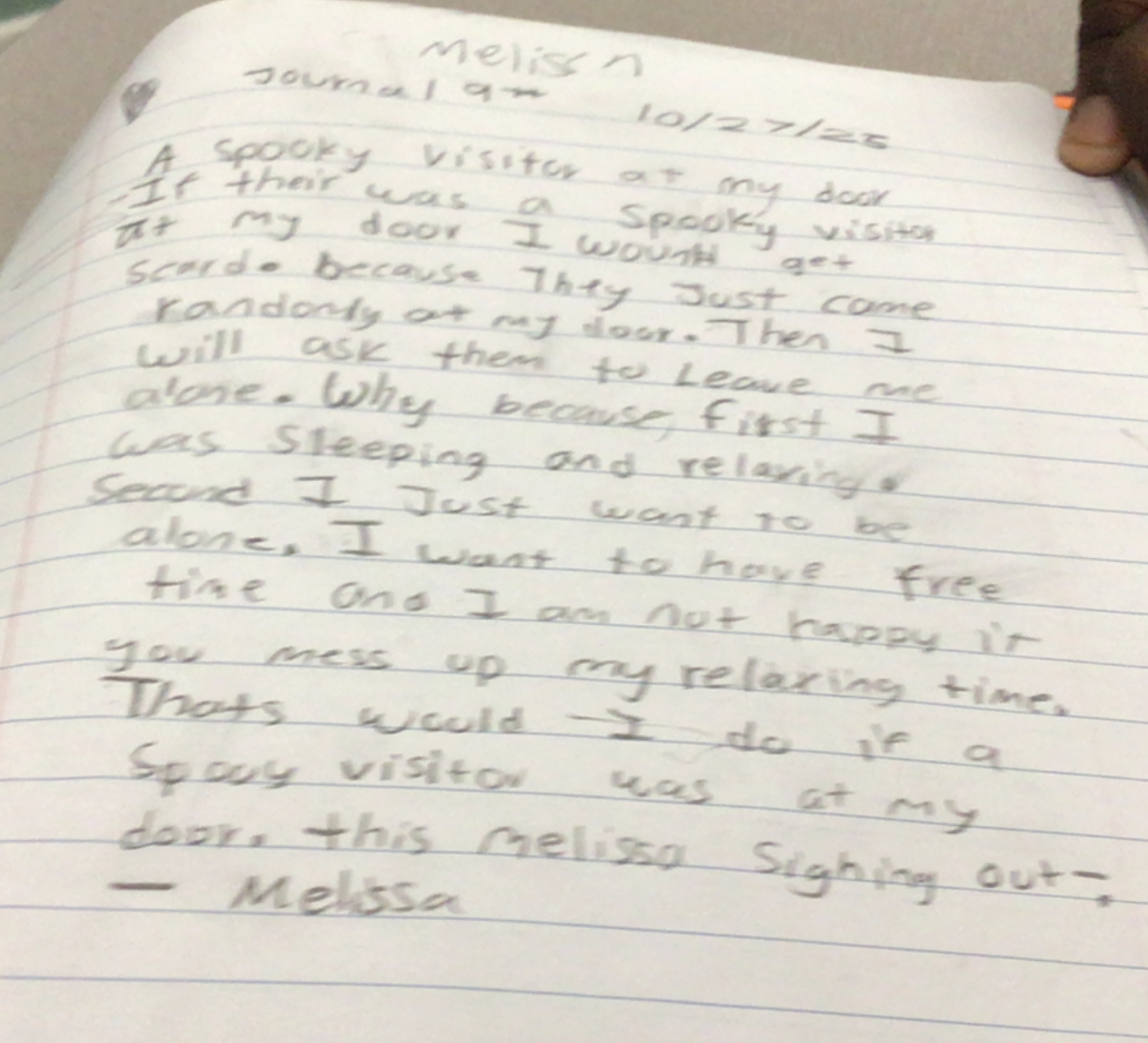 This handwriting exhibits a youthful, slightly irregular style, reminiscent of a journal entry dashed off in a moment of quiet contemplation. The writing leans slightly to the right, suggesting a forward-thinking nature, while the letter formations, such as the rounded 'm' and 'a', possess a certain softness. There is some inconsistency in letter size and spacing, as shown in phrases like 'spooky visitor' and 'sighing out,' which lends a casual, almost whimsical feel to the overall presentation. The upward slant of the lines implies optimism, although the varying pressure indicates a fluctuating level of energy and focus.