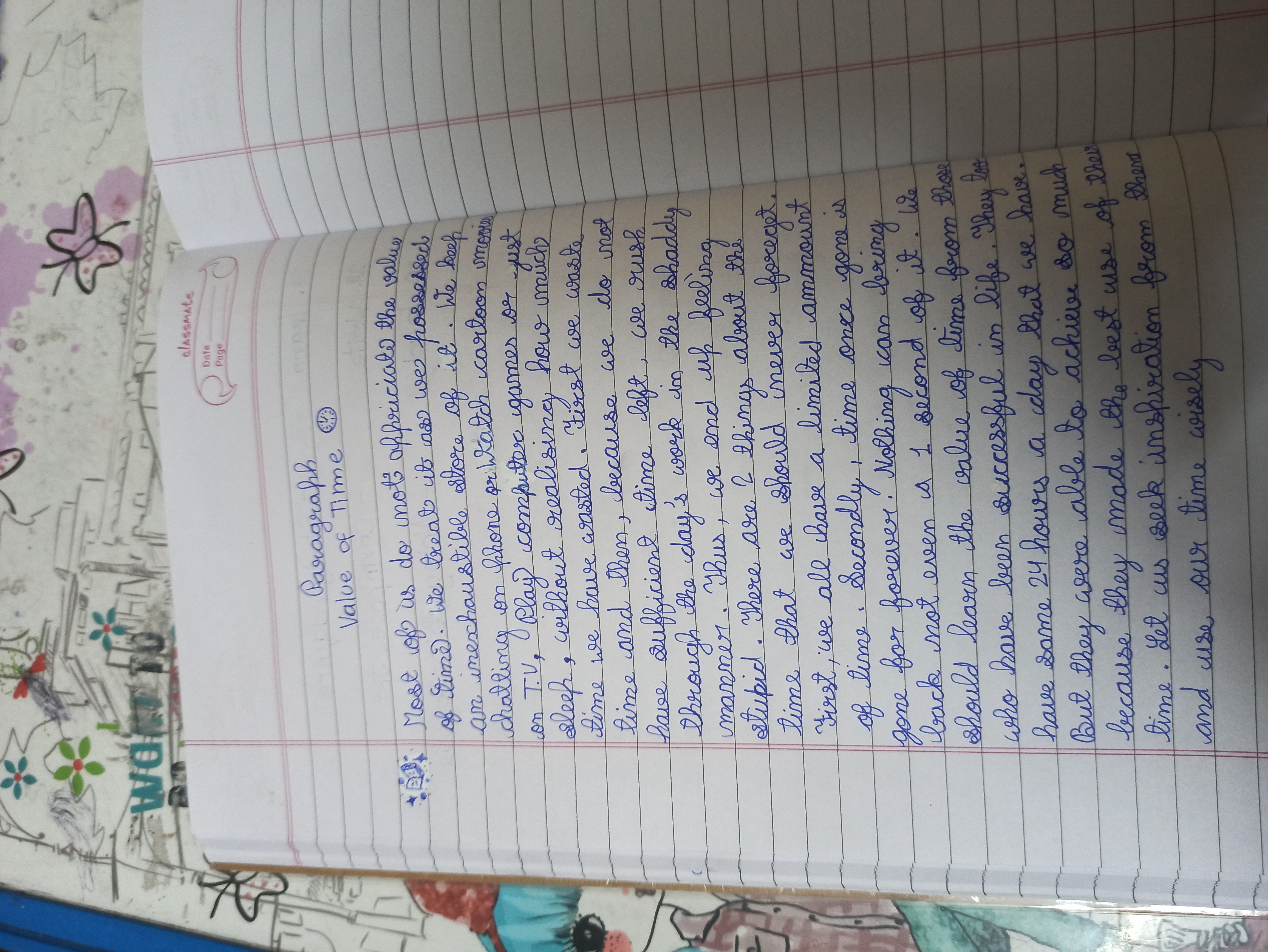 Based on the clear and organized nature of the handwriting, the writer likely possesses a thoughtful and conscientious personality. The consistent letter forms suggest a desire for clarity and precision in communication. The overall neatness implies a structured approach to tasks and a tendency towards orderliness. The content itself, reflecting on the "value of time", points to a reflective and mindful individual, someone who appreciates the importance of making the most of each moment.