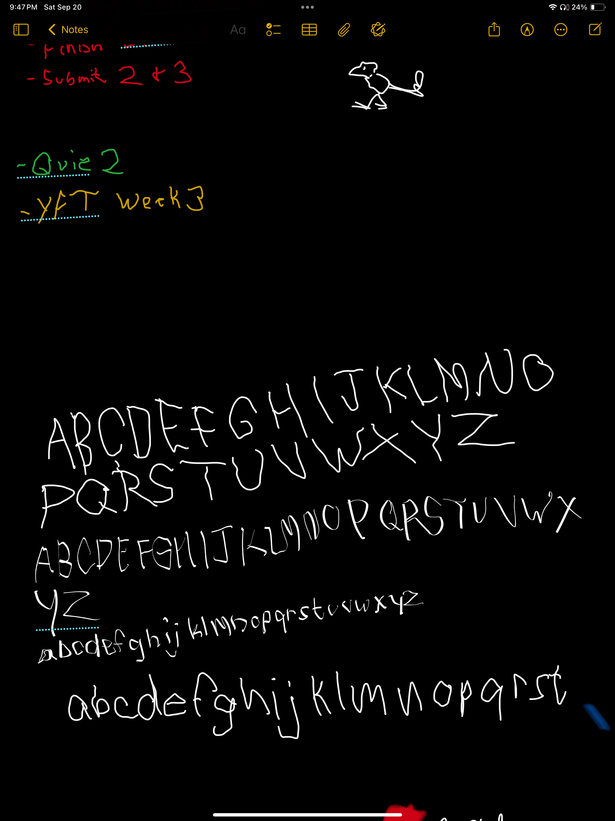 The handwriting exhibits a block-letter style, with a mix of upper and lowercase alphabets. The letters are somewhat tall and narrow, with a tendency to lean slightly to the right. There's a noticeable variation in letter size and spacing, creating a slightly inconsistent appearance. The stroke weight appears light and the forms are generally simple, lacking elaborate flourishes. The initial words such as "Finish", "Submit", "Quie", "YAT" and "Week" suggest an attempt at a more cursive style but this is not maintained in the alphabets.