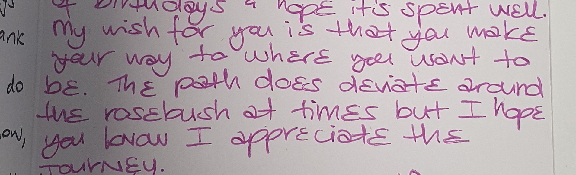 Based on these observations, the writer likely possesses a warm, empathetic, and sociable personality. They may be dreamers with a hopeful outlook, as reflected in the phrase "a hope it's spent well." The flowing style suggests adaptability and a willingness to go with the flow, while the moderate pressure indicates emotional stability and a balanced approach to life. The phrase "I appreciate the journey" hints at a person who values experiences and finds joy in the process.