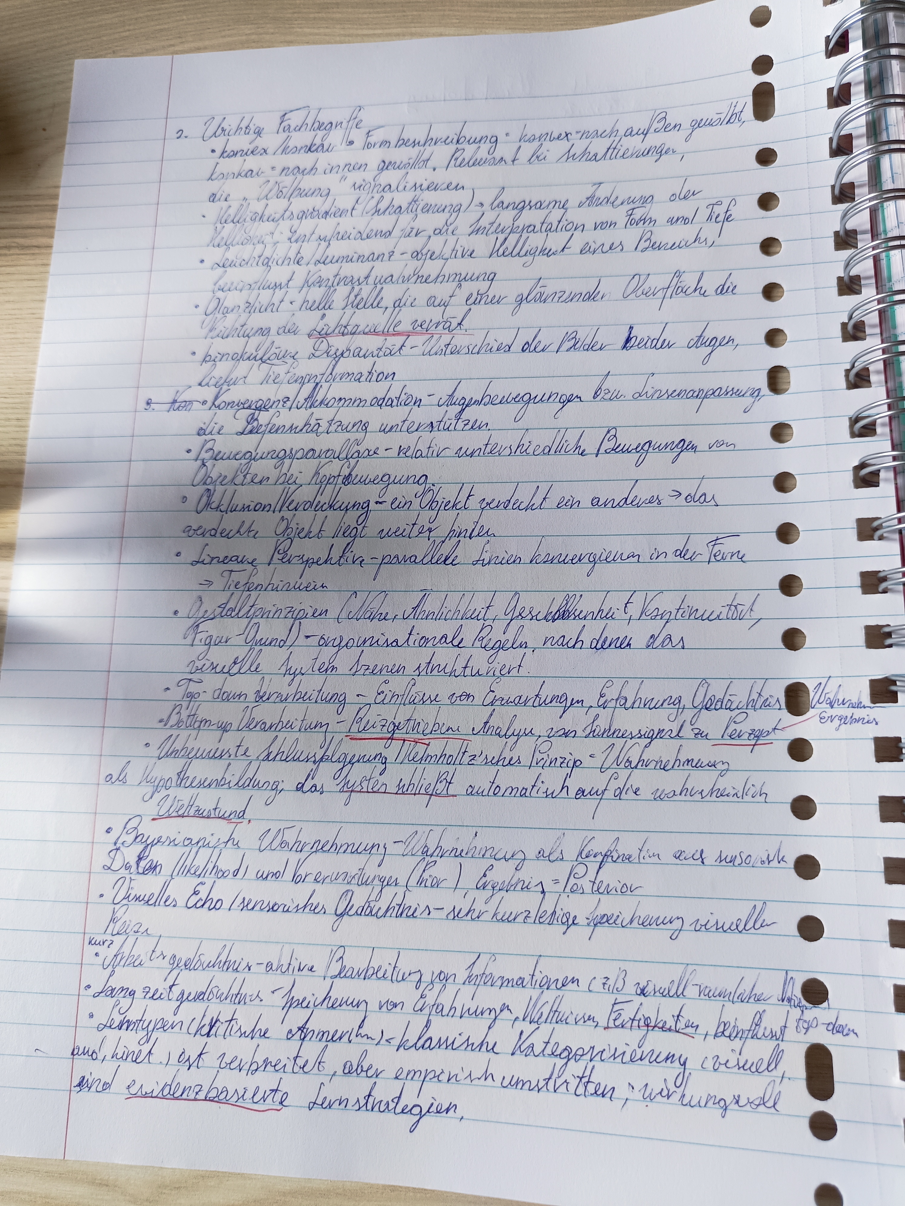 This hand demonstrates an intellectual inclination. The writer likely possesses a logical and analytical mind, enjoying the exploration of complex concepts such as 'Gestaltprinzipien' and 'Bayesianische Wahrnehmung'. The relatively consistent pressure and even spacing suggest someone who is grounded and balanced. The overall impression is that of a thoughtful and deliberate individual who values clarity and structure, as demonstrated by the careful presentation of bullet points and underlined words.