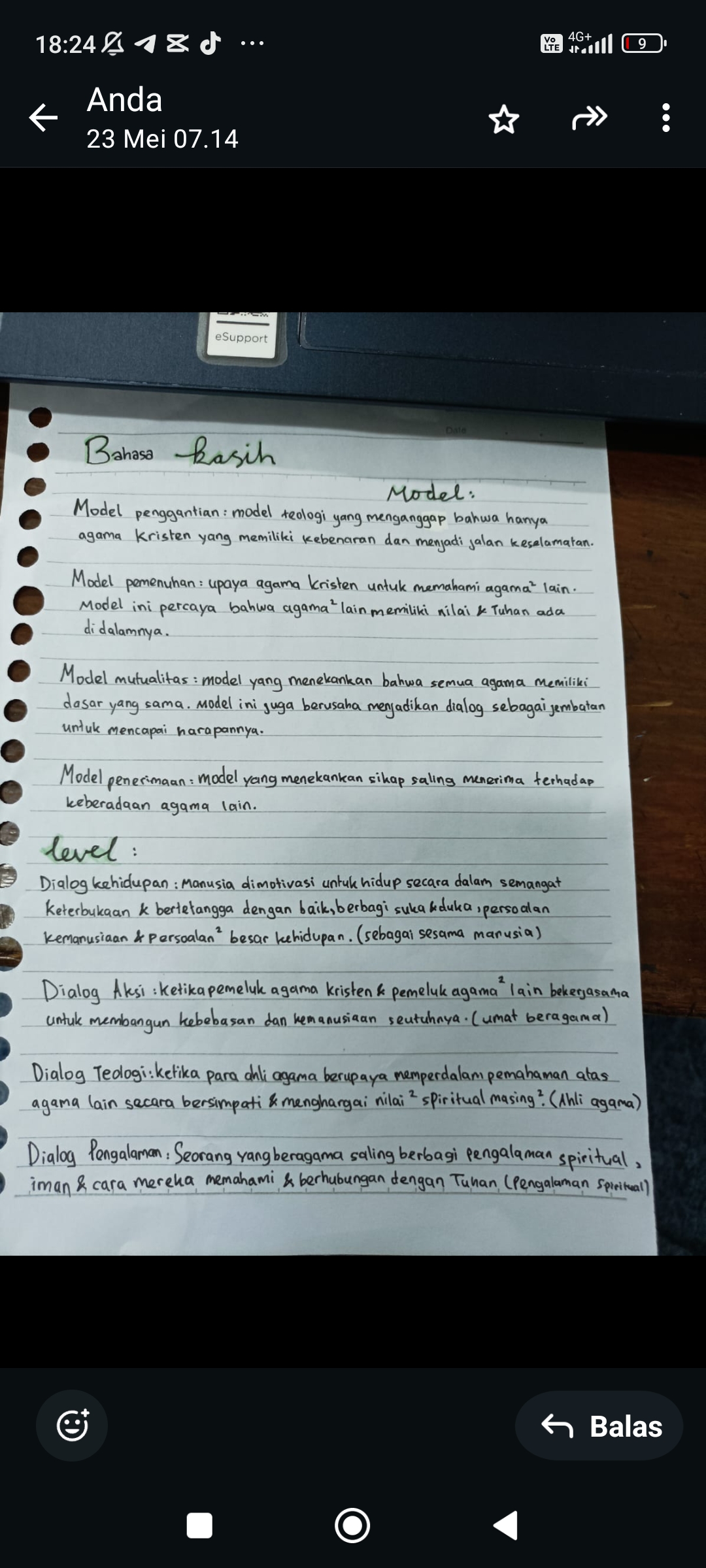 The handwriting is neat and well-organized, with consistent spacing between words and lines. The letters are formed carefully and legibly, indicating a methodical approach to writing. There is a slight slant to the right, suggesting a friendly and outgoing nature. The overall impression is one of clarity and precision, evident in phrases like "Model penggantian" and "Dialog kehidupan".