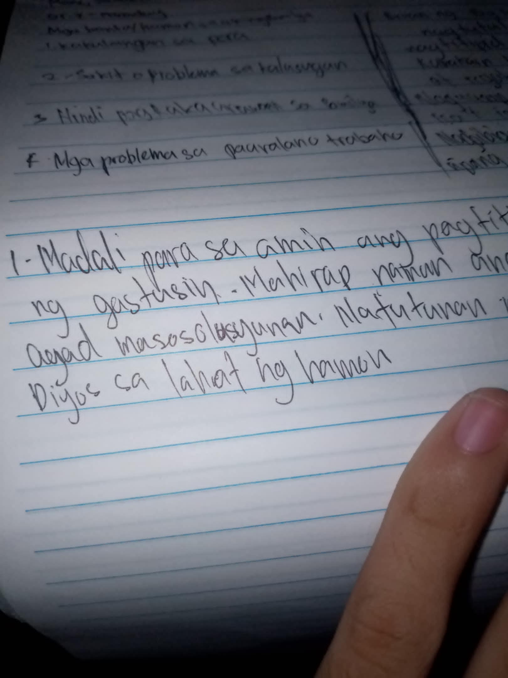 The handwriting style is characterized by a blend of rounded and angular forms. The letters exhibit a generally consistent slant, giving the writing a sense of rhythm. There's a moderate degree of pressure applied, evident in the darkness of the strokes. The size of the letters is somewhat variable, with some words appearing more compact than others. Overall, the handwriting presents a practical and straightforward appearance, with an emphasis on legibility over elaborate flourishes, for example the 'Diyos sa lahat'.