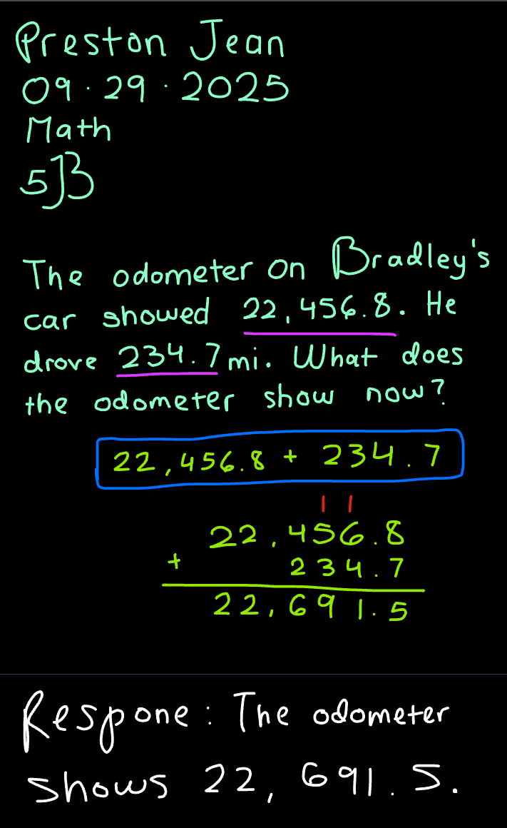 The handwriting displays a careful, almost meticulous style, evident in the neatly formed numerals and the rounded letters in words like "odometer" and "Bradley's". The letter size is consistent, and there is a deliberate spacing between words, contributing to overall legibility. The use of block lettering, particularly in the initial heading and the math problem setup, suggests a structured approach to presentation.