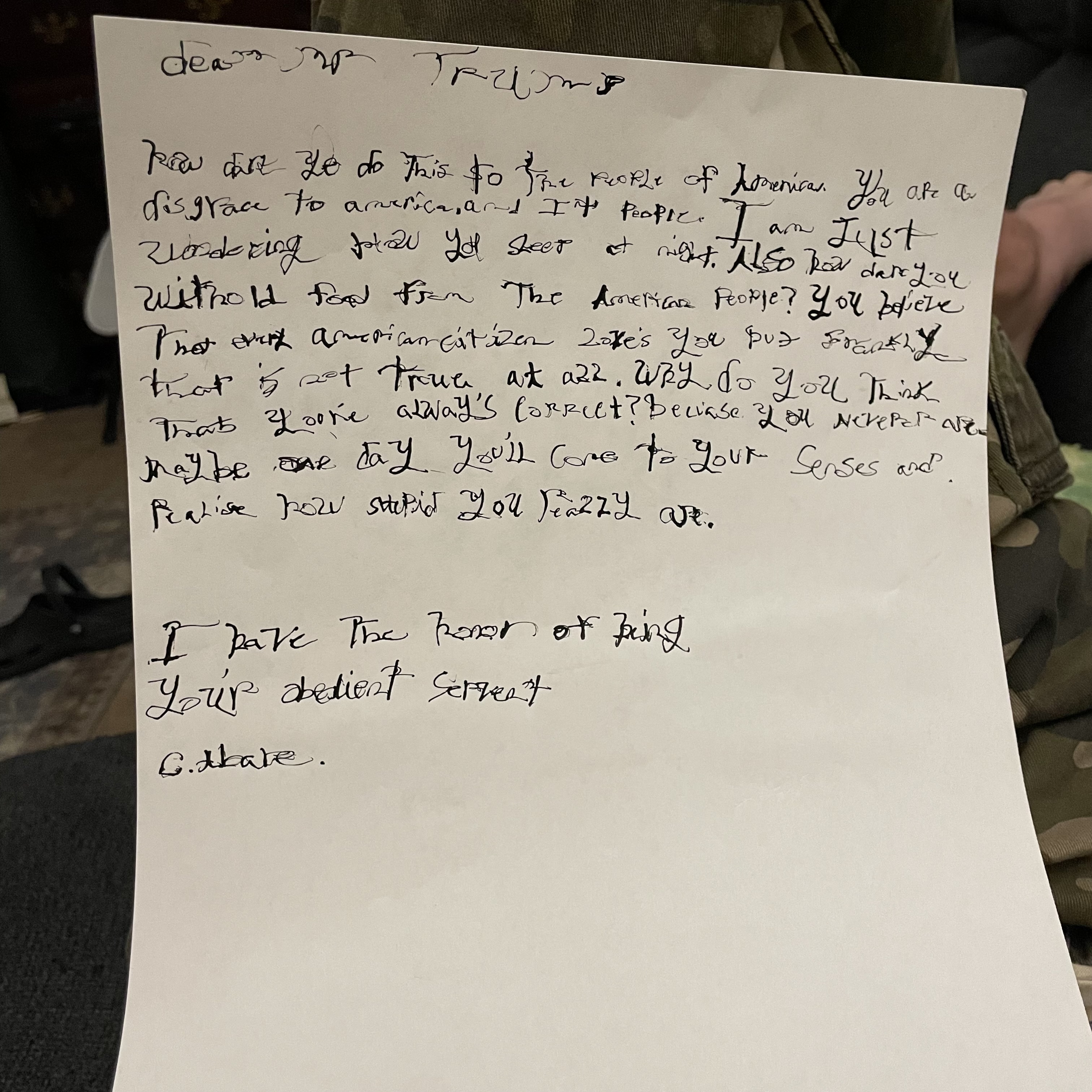 The handwriting style presents a mix of cursive and print, with some letters flowing together while others stand distinctly apart. There's a noticeable slant to the right, suggesting a degree of impulsivity and expressiveness. The size of the letters is generally large, filling the space, which could indicate a desire to be noticed. The pressure appears heavy, suggesting intensity in the writer's feelings and a strong conviction in their beliefs. Some words are less legible than others, particularly those with many strokes, such as "disgrace" and "American", suggesting the writer may have been rushing to get their thoughts on paper.