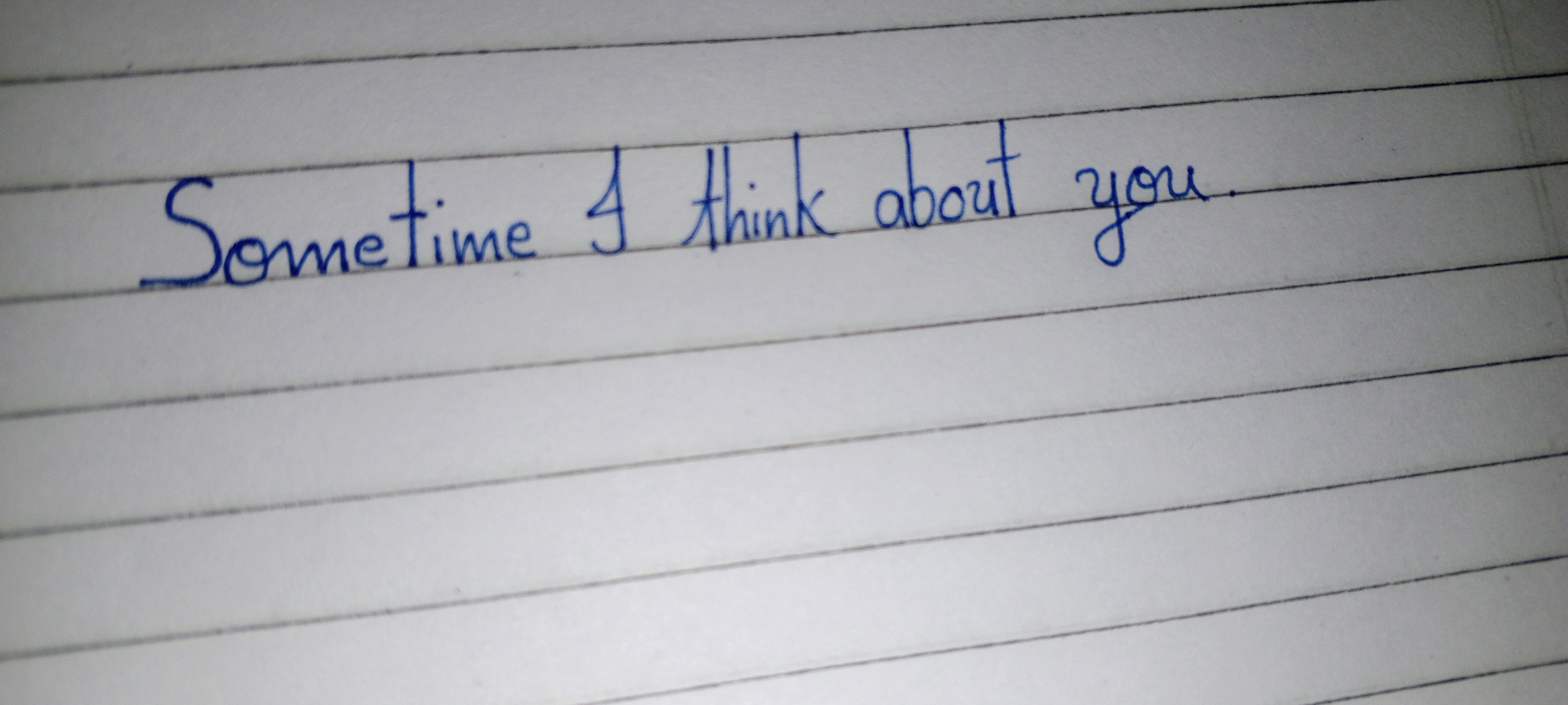 The handwriting sample presents a relaxed and slightly rounded style. The words 'Sometime I think about you' are written with a noticeable slant to the right, indicating a degree of openness. There is a slight variation in letter size, with some letters being taller than others, but overall, the writing maintains a consistent baseline, which contributes to its legibility. The 'y' in 'you' has a distinct loop, adding a touch of flair. The baseline below the first word 'Sometime' gives it more emphasis.