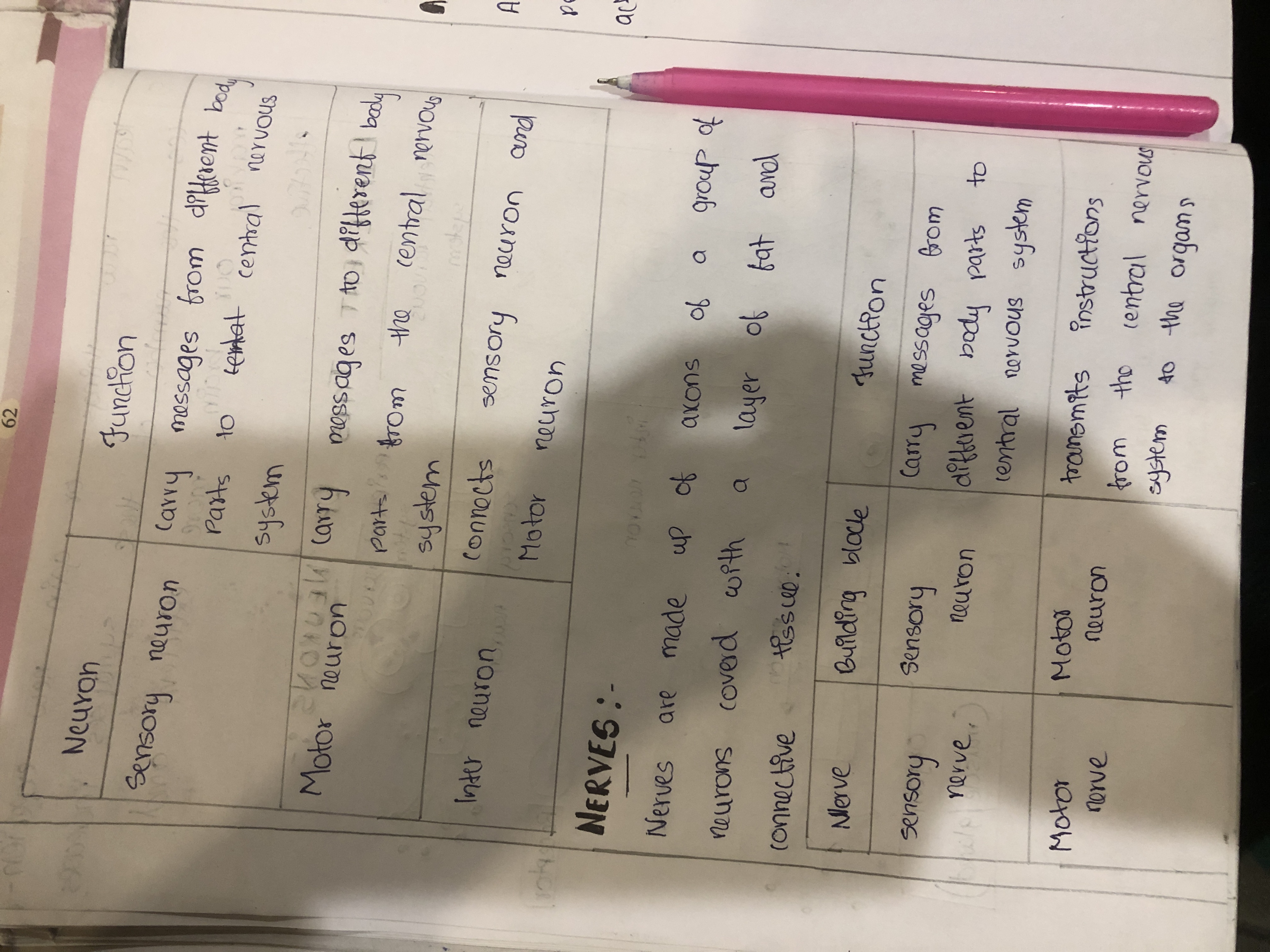 The handwriting style is neat and organized, suggesting a methodical approach. The letter forms are clearly defined, and the spacing between words and lines is consistent, contributing to overall legibility. The handwriting exhibits a slightly upright slant, and the size of the letters is generally uniform. Words such as "sensory neuron" and "connective tissue" are written with precision.