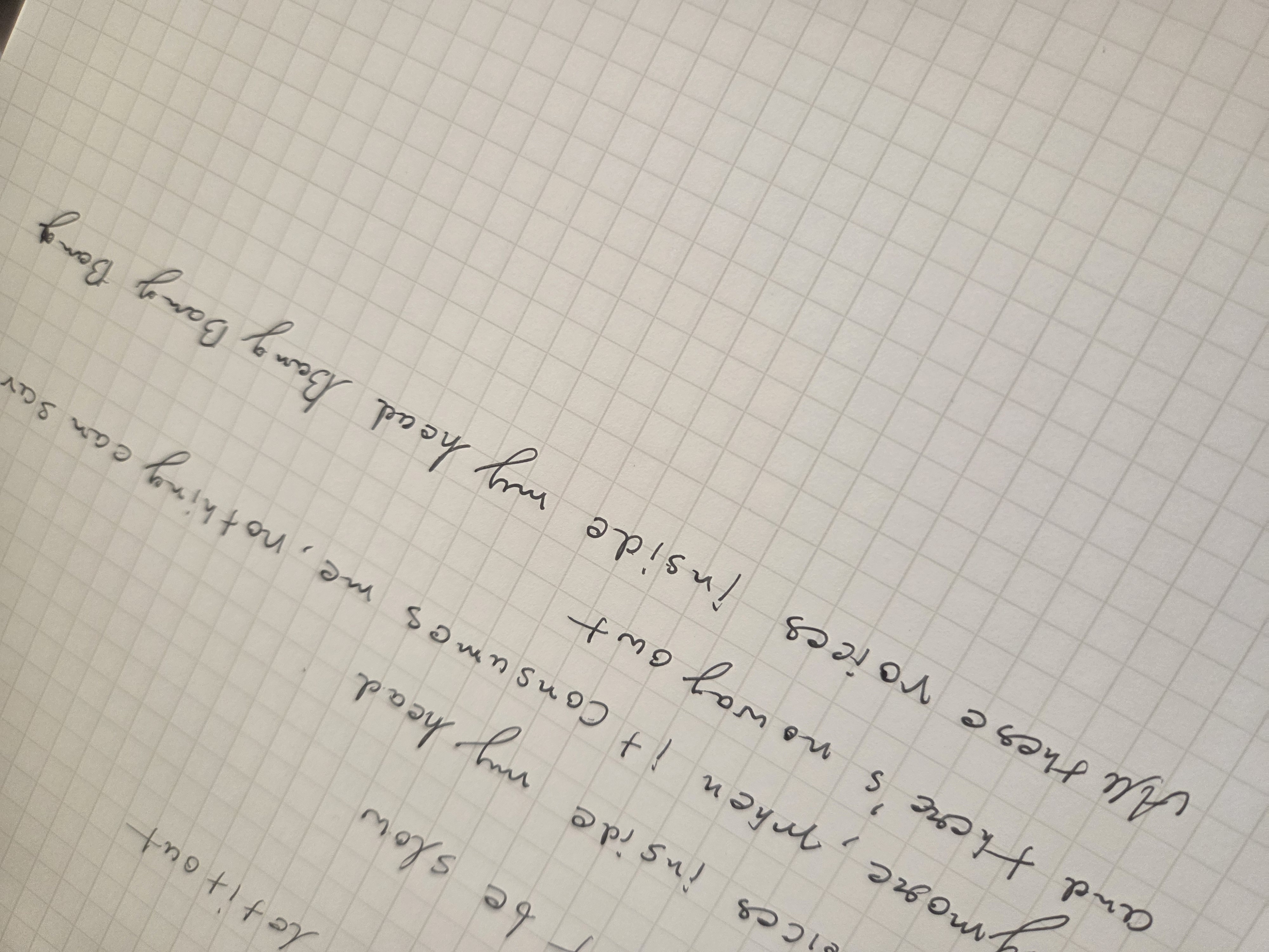 The handwriting sample presents a flowing, cursive style, where the letters often connect seamlessly, creating a sense of rhythm. There is a distinct slant to the right, and a light touch to the pressure applied to the page. The writing appears to be somewhat cramped, with a lack of spacing between words at times. The letters themselves are rounded and lack sharp angles, and there are occasional flourishes. Overall, the handwriting exhibits a certain casual elegance, as if dashed off with a sense of urgency or a stream-of-consciousness. The use of cursive, such as the connected letters in "voices inside", shows a natural and fluid hand movement.
