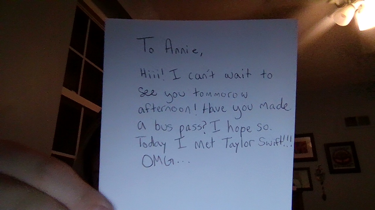 The handwriting style is characterized by its slightly childish and casual nature. There is a lack of consistent baseline, as the letters tend to wander up and down, creating an uneven appearance. The letter formation is generally simple, but there are some inconsistencies, such as the varying size and shape of the 'o's in "tommorow" and "hope so". The writing is mostly legible, but the rushed strokes contribute to some ambiguity. The ample use of exclamation marks, especially after "Taylor Swift!!!" and "Hiii!", conveys a strong sense of excitement.