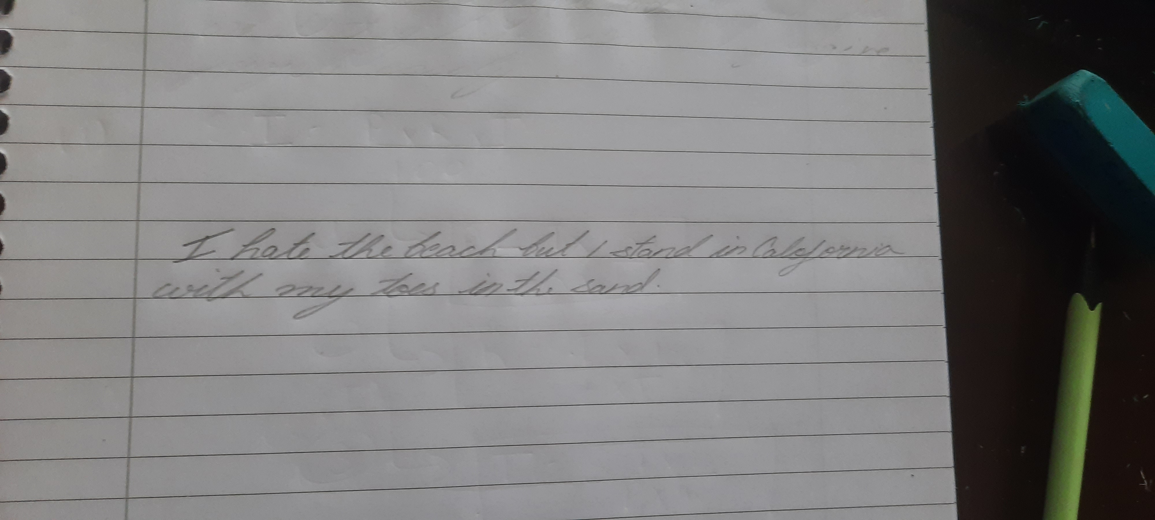 The handwriting style presented is flowing and cursive, with a gentle slant. The connections between letters are smooth, suggesting a degree of fluidity in thought and expression. The overall impression is one of elegance, but also of perhaps a slightly hesitant or restrained energy. Some letter formations, like the 'I' in 'I hate' and the 't's are a little soft and rounded, rather than sharp and defined. The phrase 'I stand in California' shows the writer to be neat and relatively consistent.