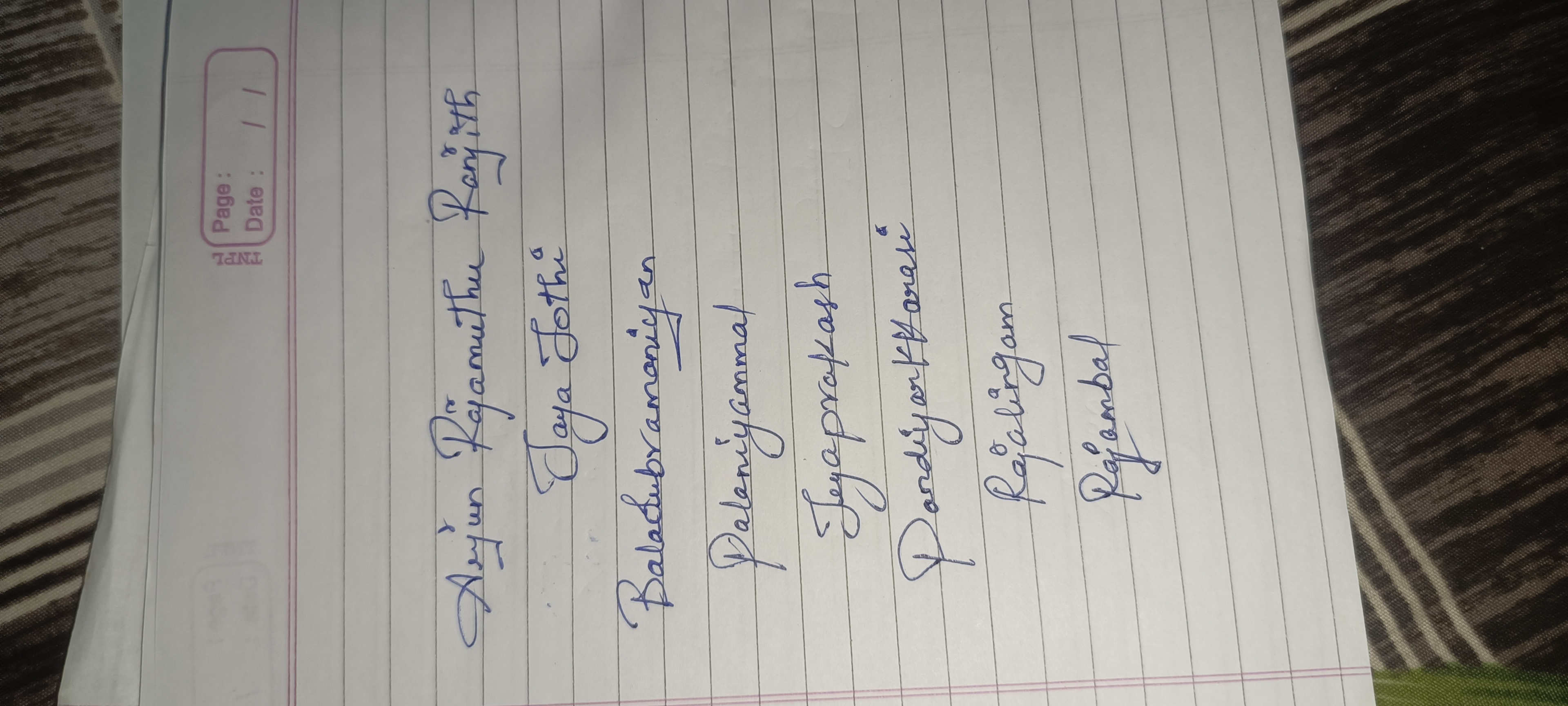 This handwriting style is characterized by its elegant loops and curves, particularly noticeable in letters like 'R' in 'Rajamuthu' and 'J' in 'Jaya'. The script has a rhythmic flow, with a moderate slant to the right. The pressure applied is fairly consistent, resulting in a smooth and legible text. While each word is clearly defined, there is an artistic connection between the letters that gives the writing a distinct personality.