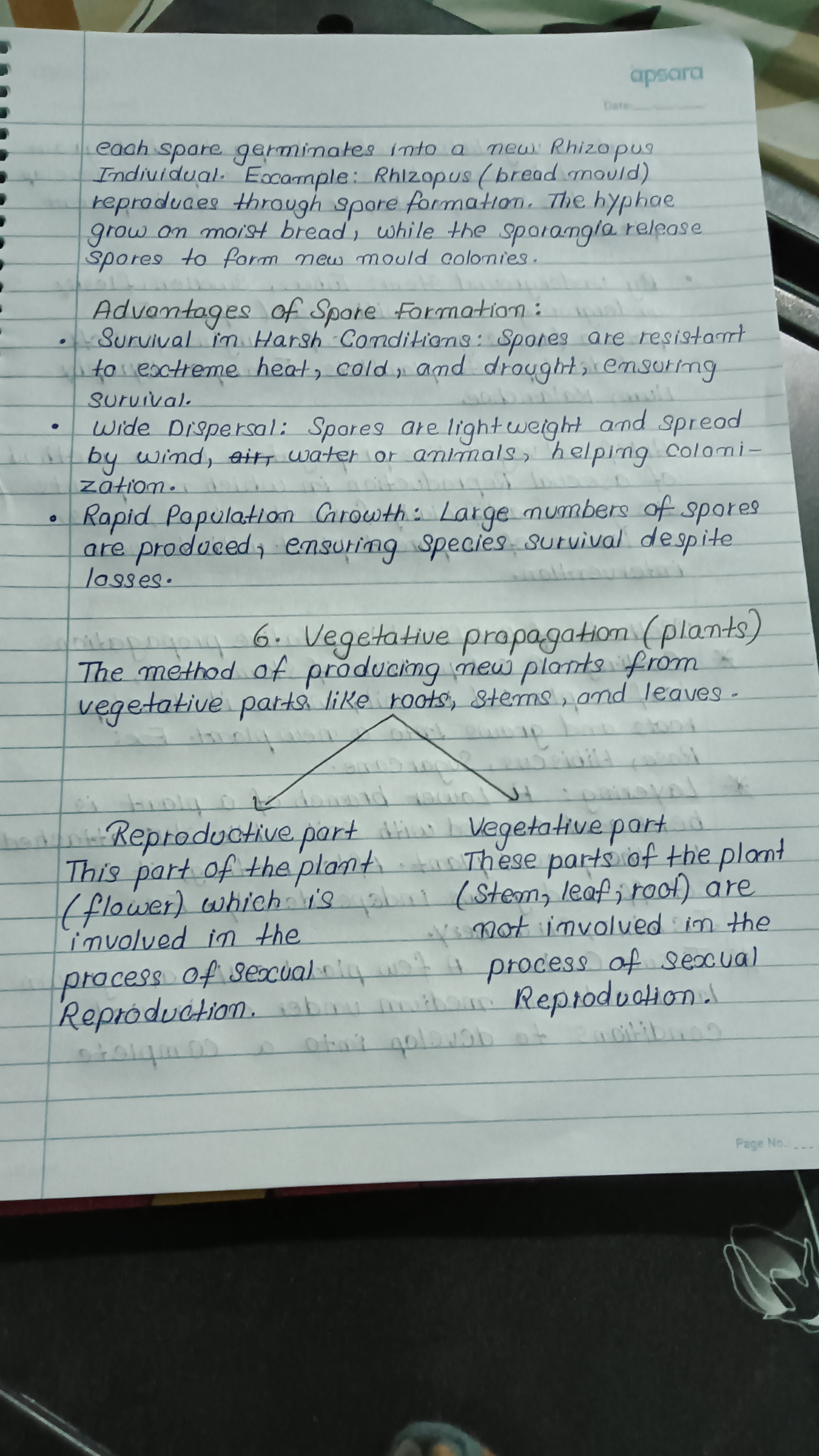 The handwriting presents a neat and upright style, evident in phrases like "Advantages of Spore Formation" and "Reproductive part." The letter size is generally consistent, although there is some slight variation, and the writing maintains a fairly even baseline. The formation of individual letters is clear and legible, suggesting a deliberate and careful approach to writing. Overall, the handwriting appears organized and well-structured, indicating attention to detail.