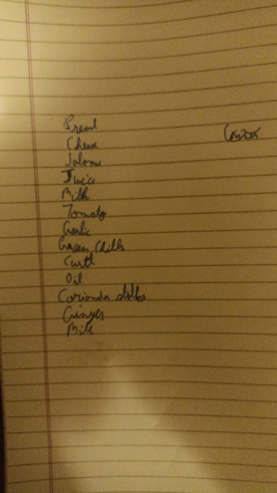 The handwriting is mostly cursive, with a slight forward slant. Letter formations are generally rounded, but there are some inconsistencies in letter size and spacing, for example between "Brend" and "Cheese". The writing appears somewhat cramped, especially noticeable in words like "Corianda stolke" and "Green Chills". The overall impression is that it was written quickly, possibly while standing, and without a great deal of attention to detail.