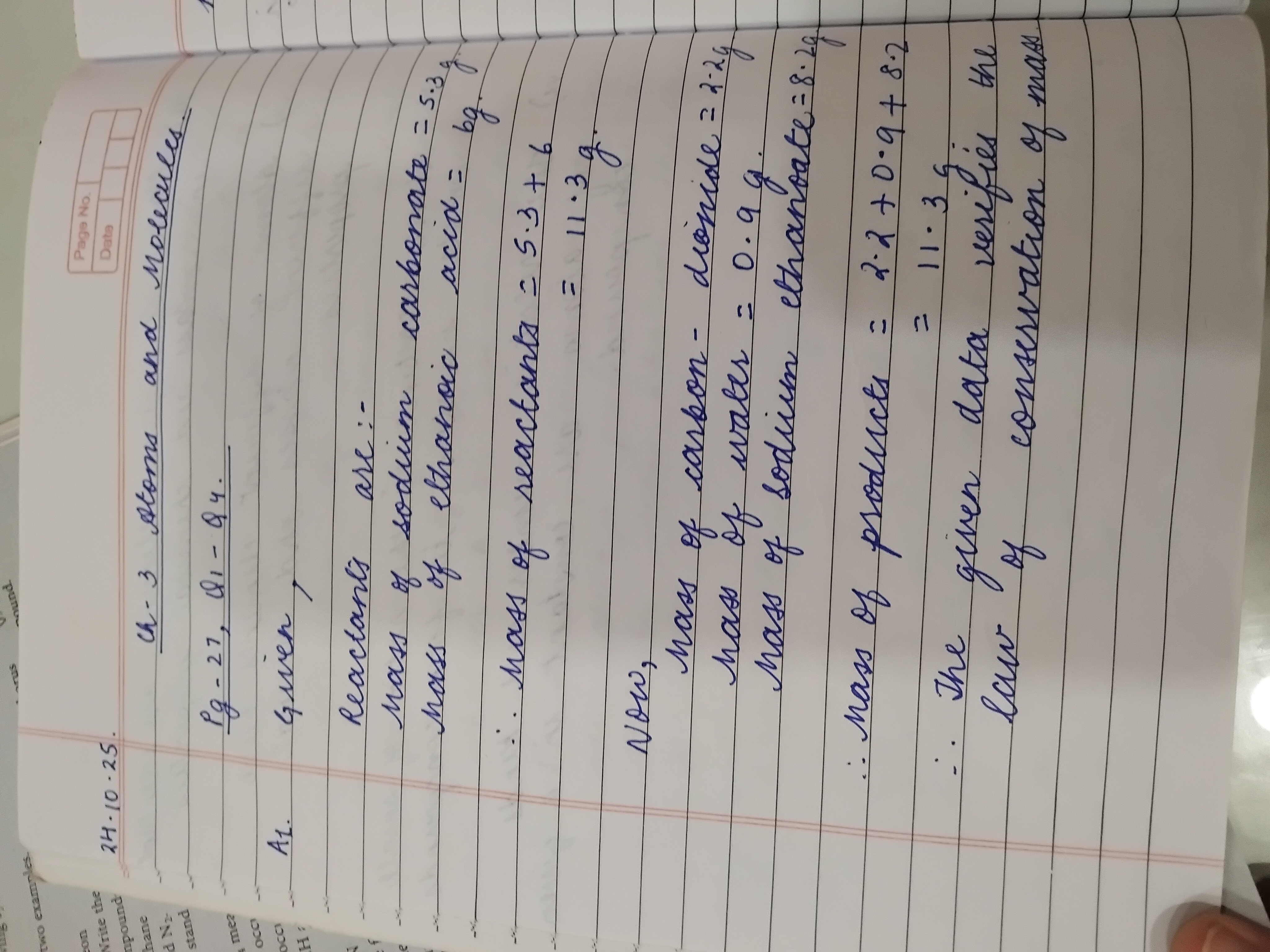 The handwriting in this sample demonstrates a meticulous and careful style. The letters are well-formed and exhibit a consistent slant, suggesting a controlled and deliberate approach to writing. The pressure appears to be even, indicating a steady hand and a consistent application of force. The letter size is generally uniform, and the spacing between words is regular, contributing to the overall neatness of the handwriting. There are flourishes in the uppercase letters such as the 'M' in 'Mass' and 'Reactants' adding a touch of elegance, however the 'g' is written differently at times, impacting the consistency.