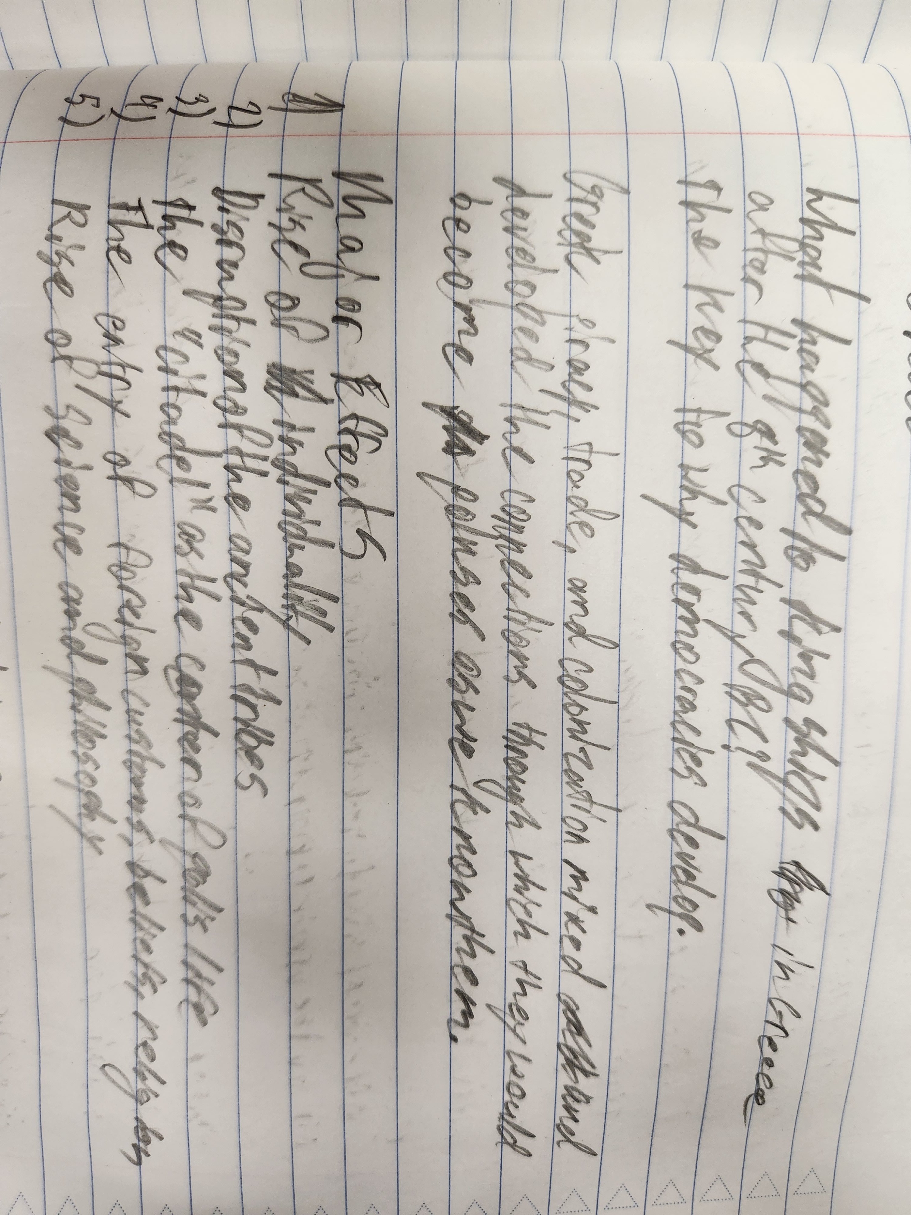 The handwriting is characterized by a flowing, cursive style, with letters that often connect to each other within words. There's a slight slant to the right, visible in words like "happened" and "develop." The size of the letters varies, with some words appearing more compact than others, like the difference between "colonization" and "mixed." The pressure applied to the writing utensil seems fairly consistent, though there are instances where the ink appears lighter, particularly in the words in the first few lines. The writing overall appears functional, but not meticulously neat. There is some use of capital letters to highlight the important words.