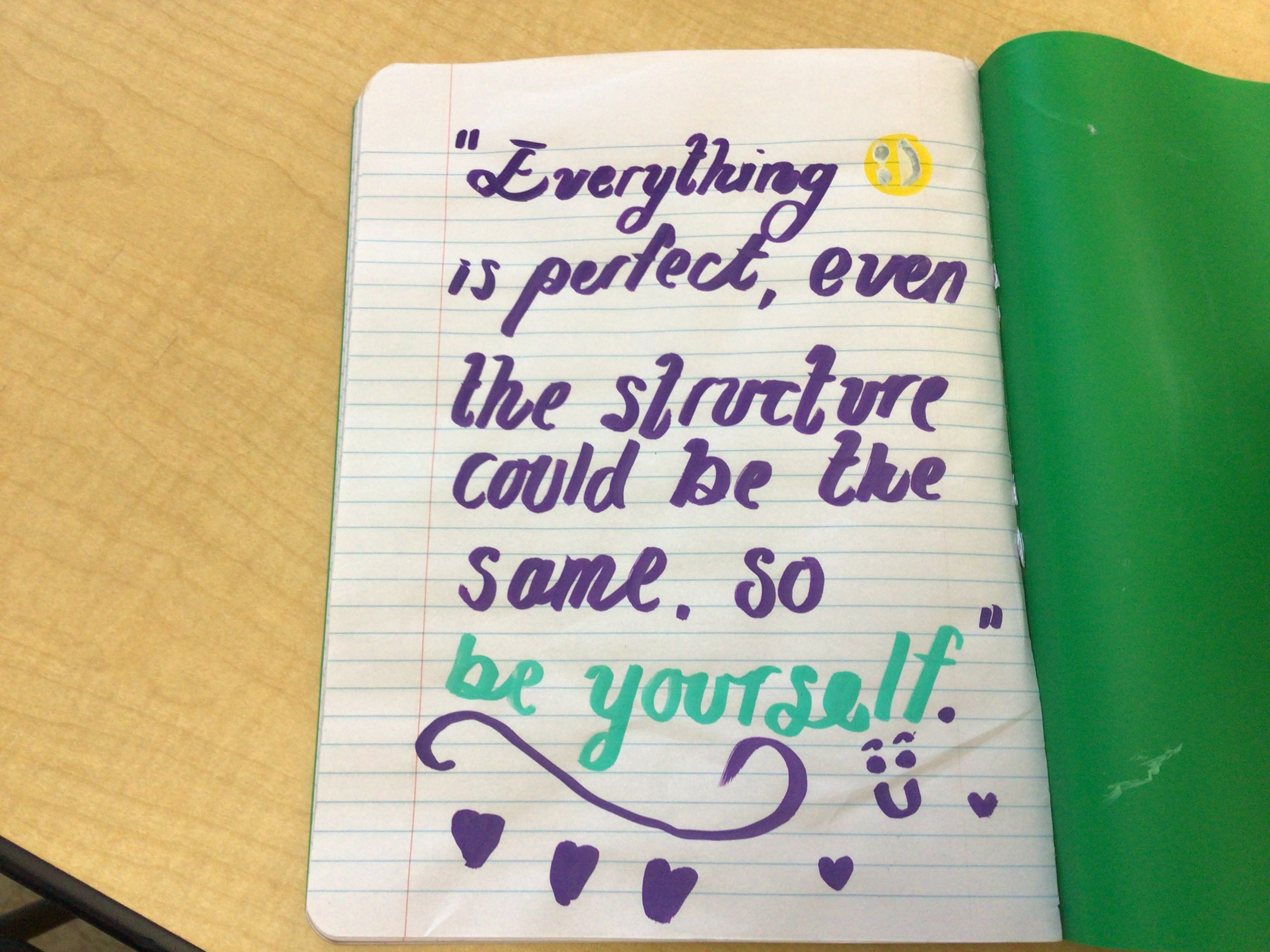 Based on this handwriting, it is possible to infer a personality that is creative, expressive, and possibly somewhat dramatic. The bold strokes and playful use of color suggest someone who enjoys making an impression and isn't afraid to stand out. The message itself, "Everything is perfect, even the structure could be the same, so be yourself", reflects an optimistic and encouraging mindset, potentially indicating a caring and supportive nature.