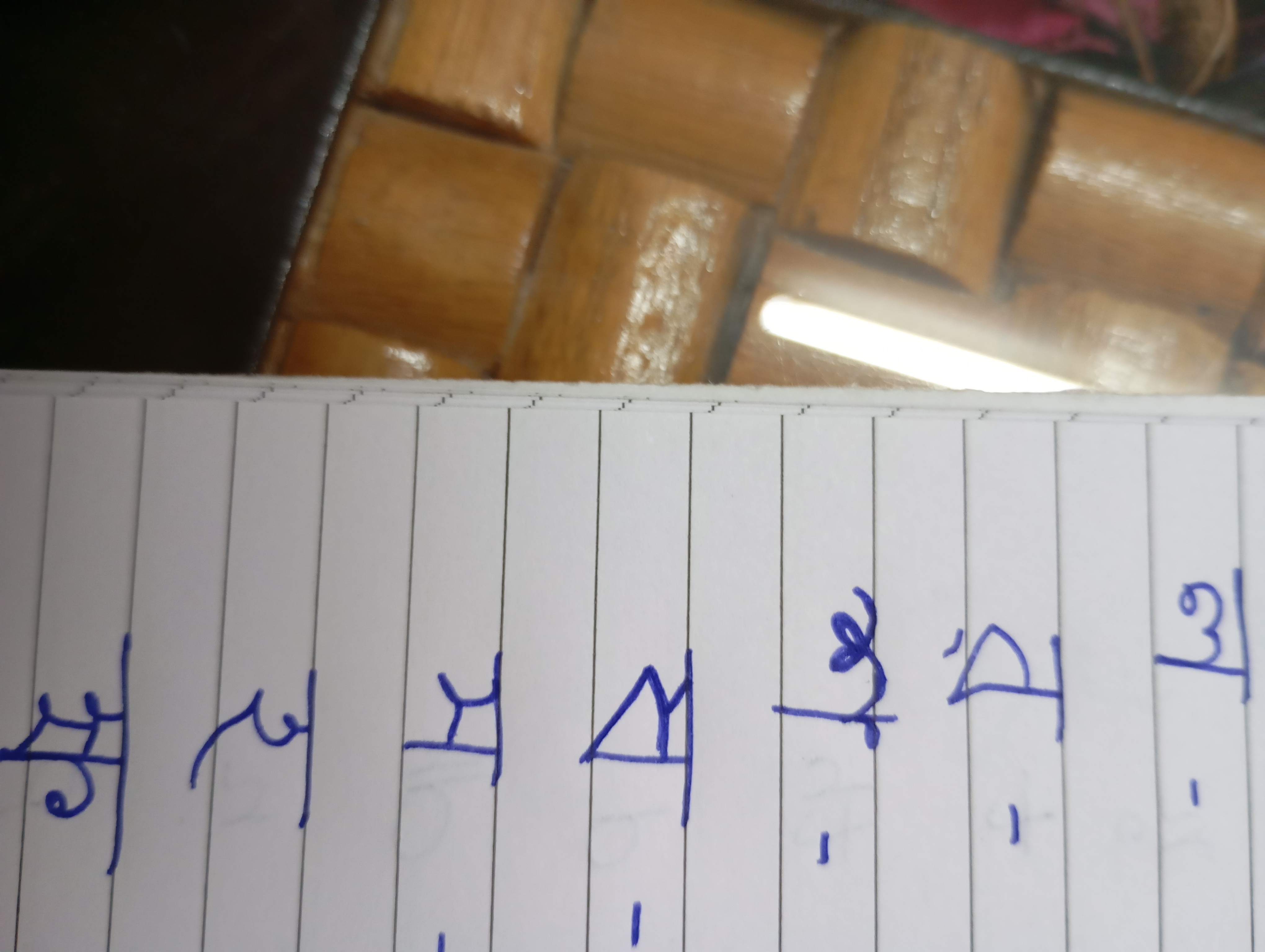 This handwriting showcases a distinctive and stylized approach. The strokes are deliberate, and the letterforms are quite unique, each with its own character. The characters are angular and sharply defined. There is a high degree of artistic flair, as can be seen in the flourishes of the first character on the left, with the little curl on the lower left side. Overall, there is a certain uniformity in height and width of each character.