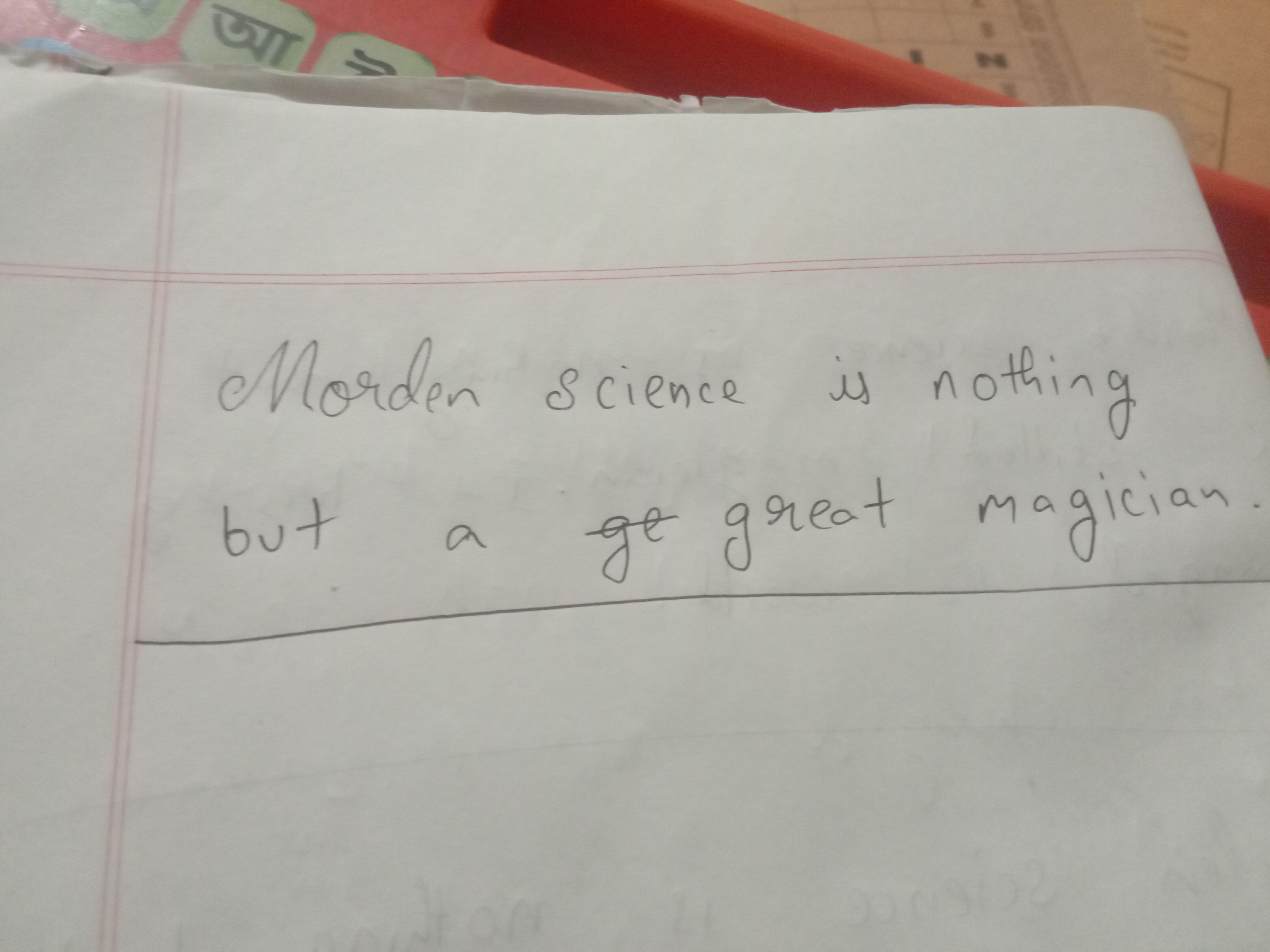 The handwriting in this sample presents a blend of cursive and print styles, with rounded letterforms and a moderate slant. The words "Modern science" are connected, suggesting a natural flow, while other words appear more deliberately formed. The letter heights are fairly consistent, but the spacing between words varies, giving it a slightly uneven appearance. Overall, the handwriting is legible, but it lacks a certain flair, coming across as practical and straightforward.