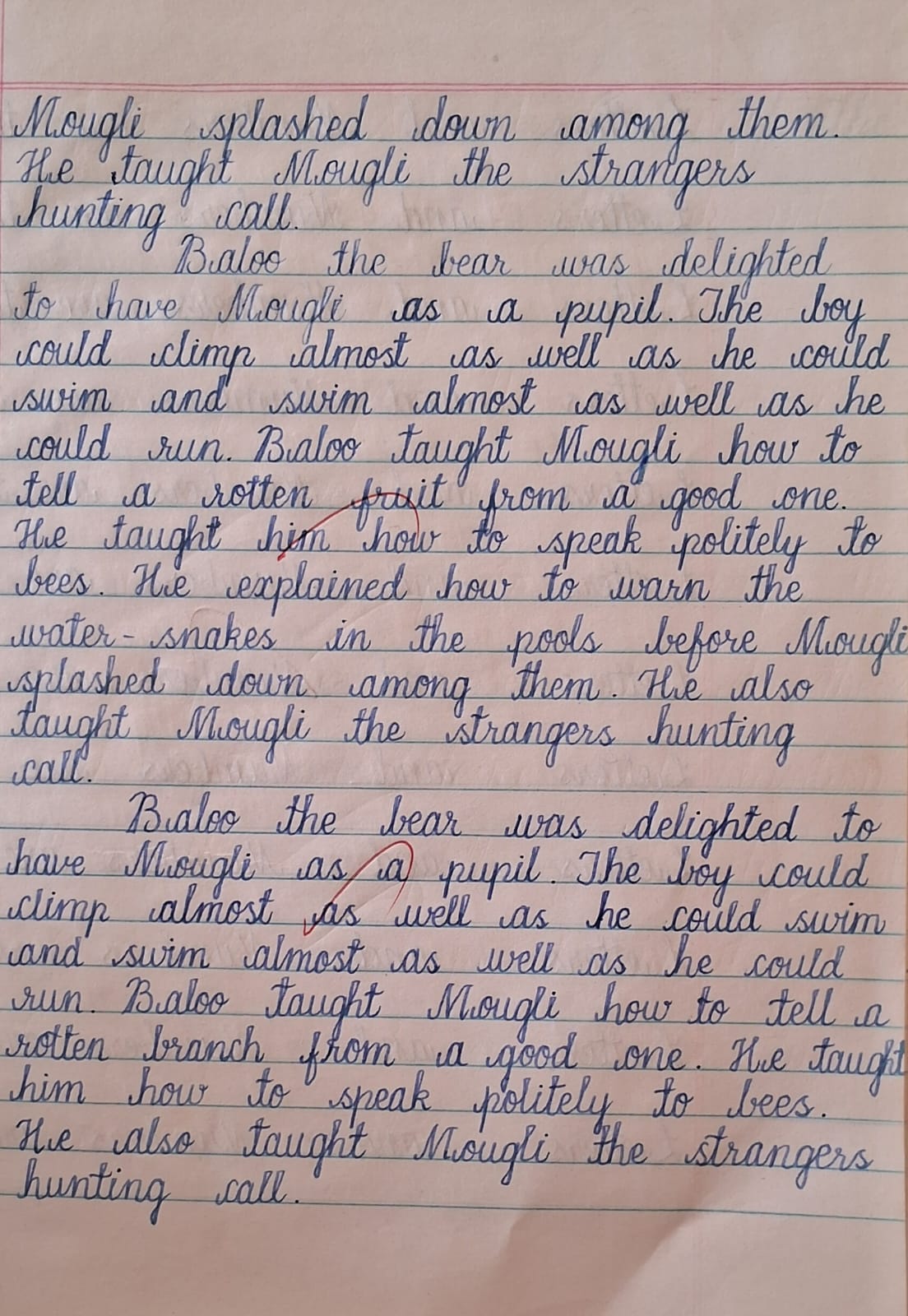 The handwriting style is a carefully executed cursive, reminiscent of Palmer Method training. The loops in letters like 'l', 'h', and 'b' are generous and well-formed. The connections between letters are generally smooth, indicating a good level of fluency. However, there is a slight lack of consistency in the size and slant of the letters, particularly noticeable when comparing different instances of the same word, such as "Mougli".