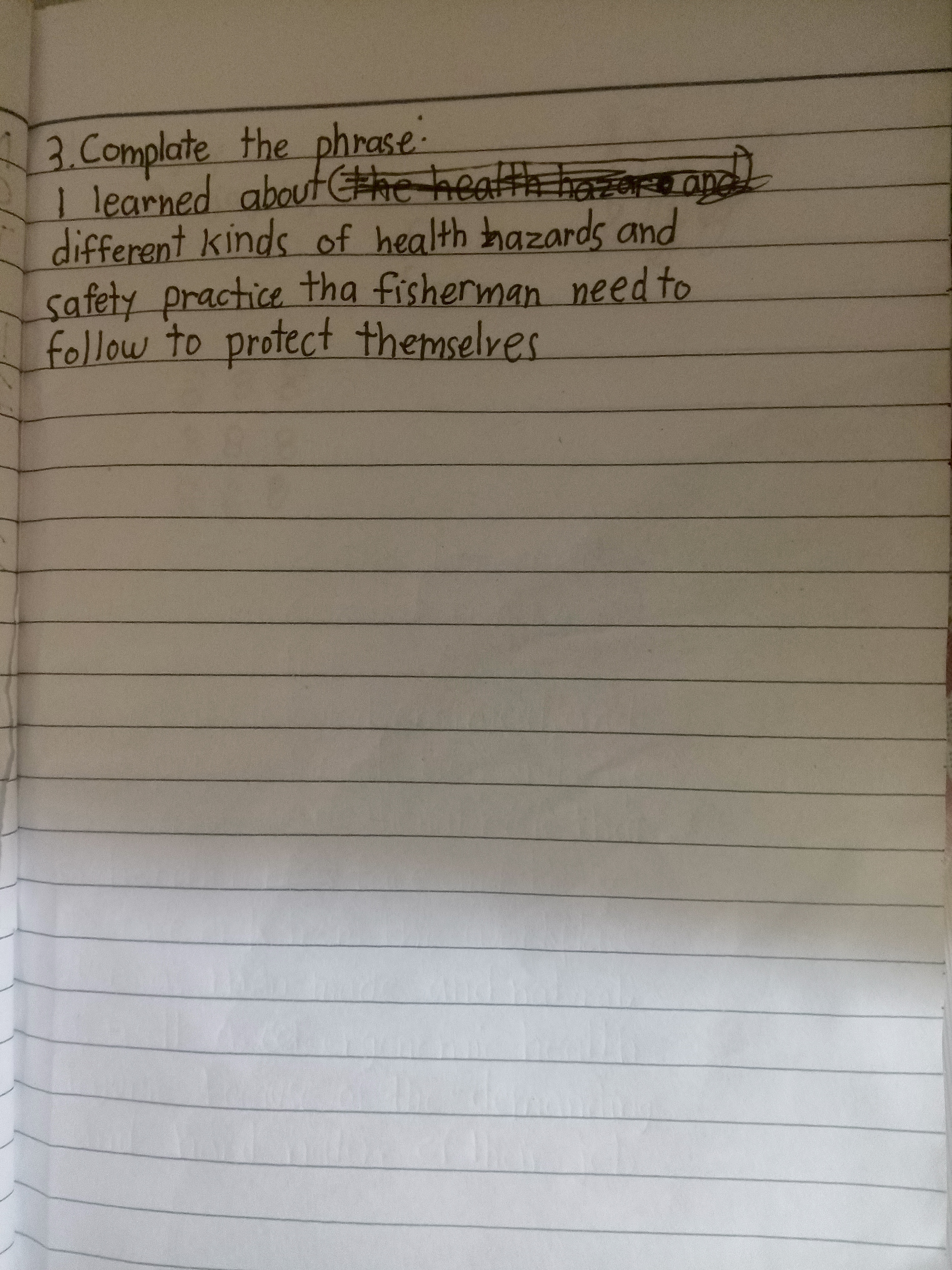 The handwriting is neat and uniform, suggesting a practical and methodical approach. The letters are generally well-formed, though there is a slight angularity to some strokes, particularly in words like "hazards" and "practice". The writing is fairly consistent in size and spacing, creating a sense of order. The cross-out on "the health hazaro and" suggests a moment of revision or correction.