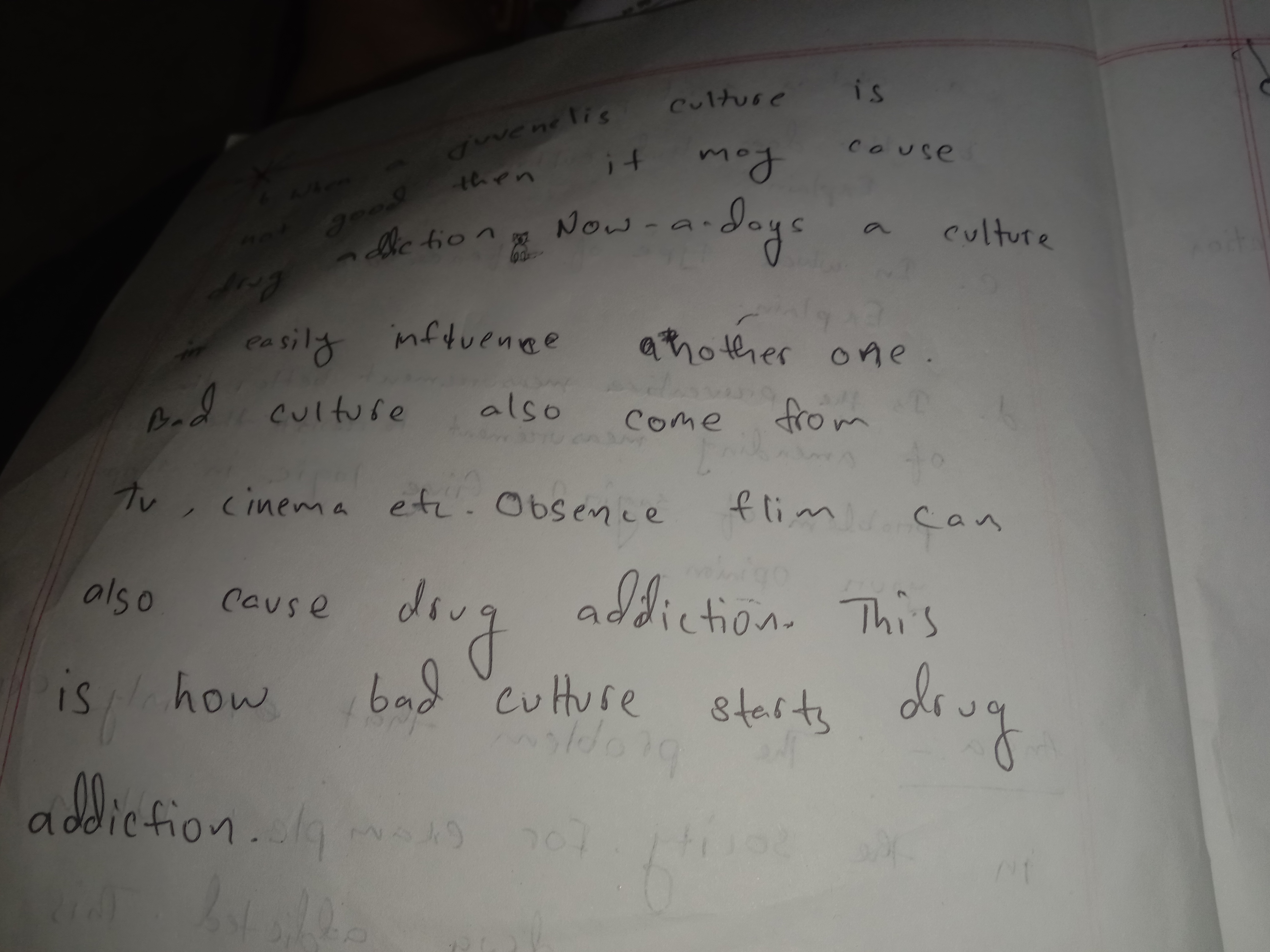 This handwriting sample presents a relaxed and somewhat inconsistent style. The writing exhibits a rounded form with variable letter sizing. The connections between letters appear loose and not always fluid, with occasional breaks within words. There is a slight rightward slant to the writing, and the baseline wavers noticeably. Words like "culture" and "addiction" are legible but lack precision, suggesting a focus on conveying the message rather than meticulous execution.