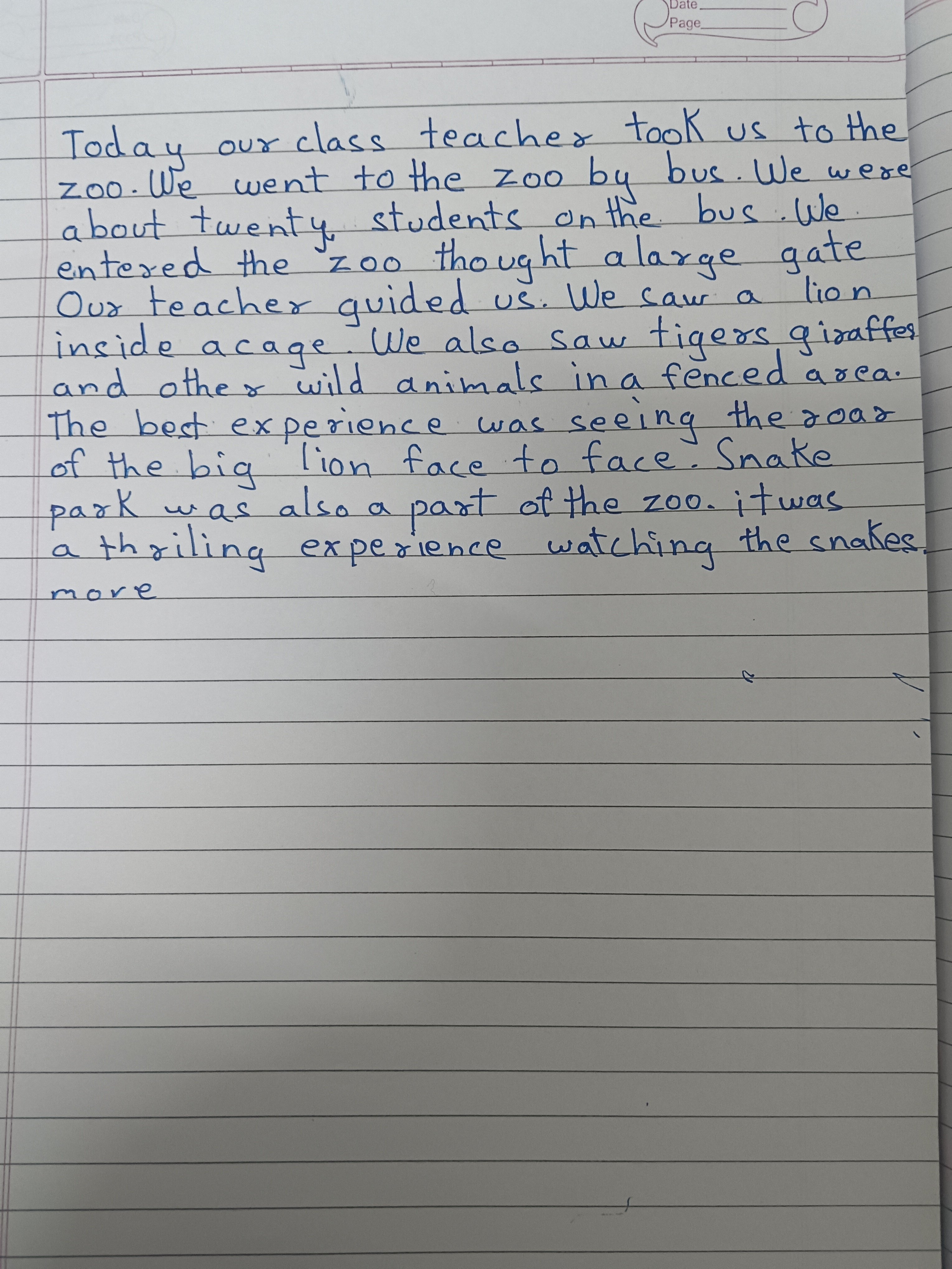 The handwriting sample reveals a neat and upright style, with consistent letter sizing and spacing. The letters are well-formed and legible, although there is a slight roundness to them. Words like "teacher", "zoo", and "experience" are written with a clear and deliberate hand, suggesting a careful approach to communication. The baseline is generally even, indicating good control and stability.