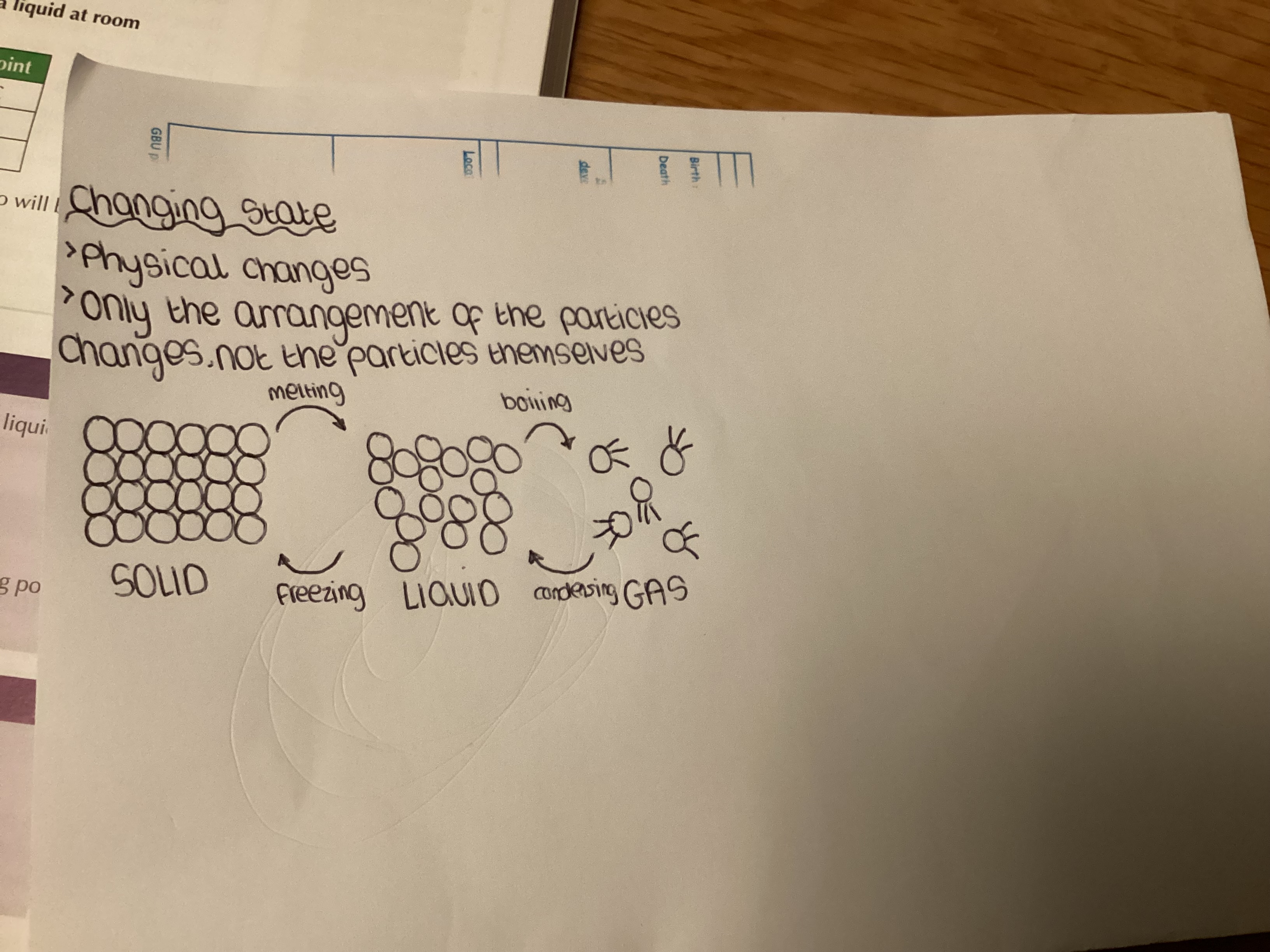 The handwriting presents a mix of print and cursive, tending towards a more blocky style, especially evident in words like "SOLID" and "LIQUID". The letters are generally rounded, and there's a consistent slant. Capital letters like in "Changing State" are somewhat more stylized with exaggerated curves. The spacing between words is generally consistent, contributing to overall readability. The pressure appears even, without significant variations, indicating a steady hand. The writing sample shows an organised layout with headings and diagrams.