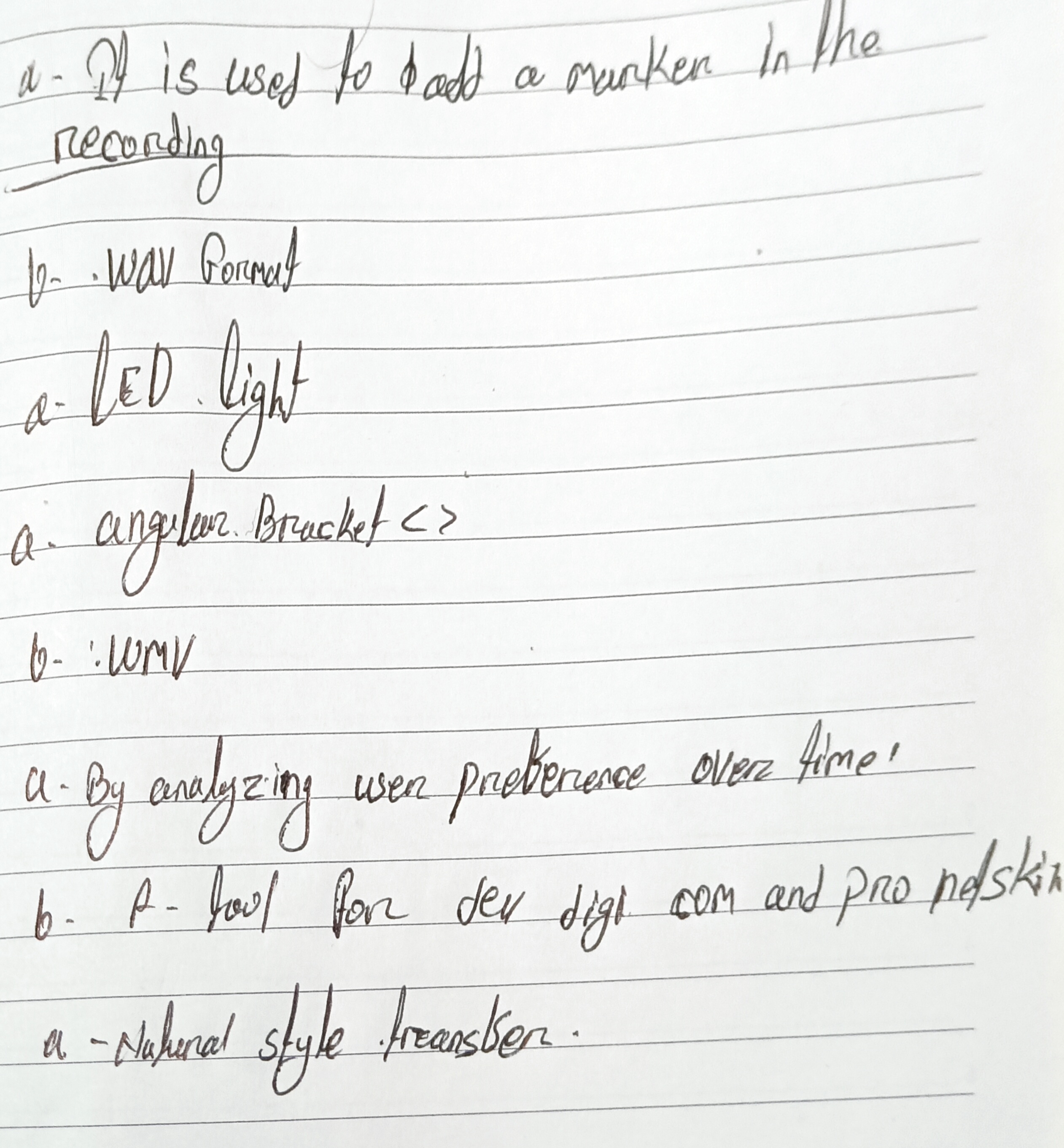 The handwriting presents a fluid and connected style, seen in words like "analyzing" and "natural". There is a blend of rounded and angular forms, especially evident in the letters 'a' and 'r'. The writing slants slightly to the right, and there's variability in letter size and spacing. Overall, the writing is moderately legible but can be somewhat inconsistent, for example in 'marker' vs 'recording'.