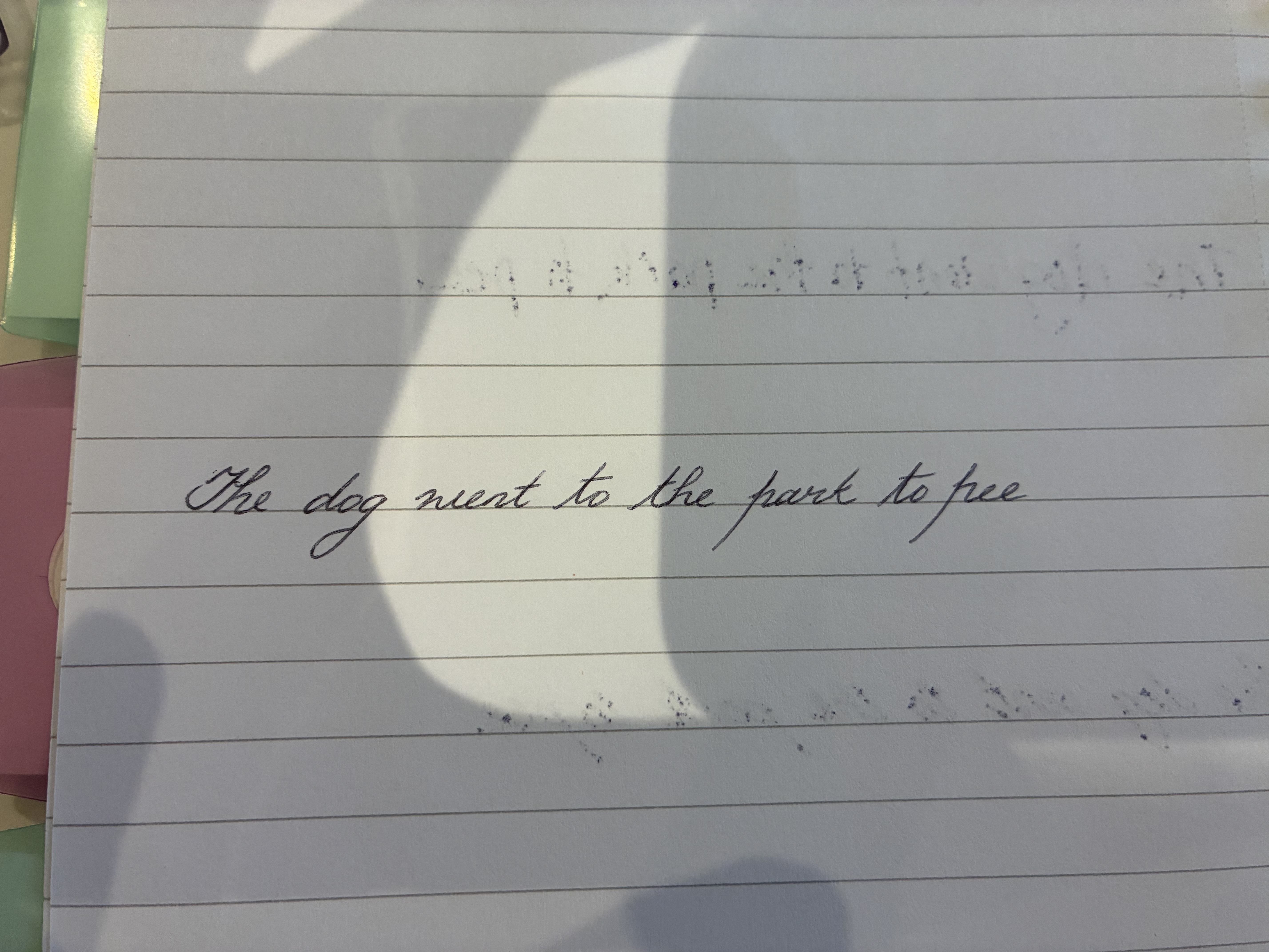 The handwriting presents a fluid and connected script, characterized by gently rounded forms. The letters exhibit a consistent slant, lending a sense of rhythm to the text. The connections between letters appear natural and unforced, contributing to an overall impression of fluency. Words such as "dog", "park", and "free" are clearly formed, demonstrating good legibility. The writing respects the horizontal lines of the paper, maintaining a relatively even baseline.