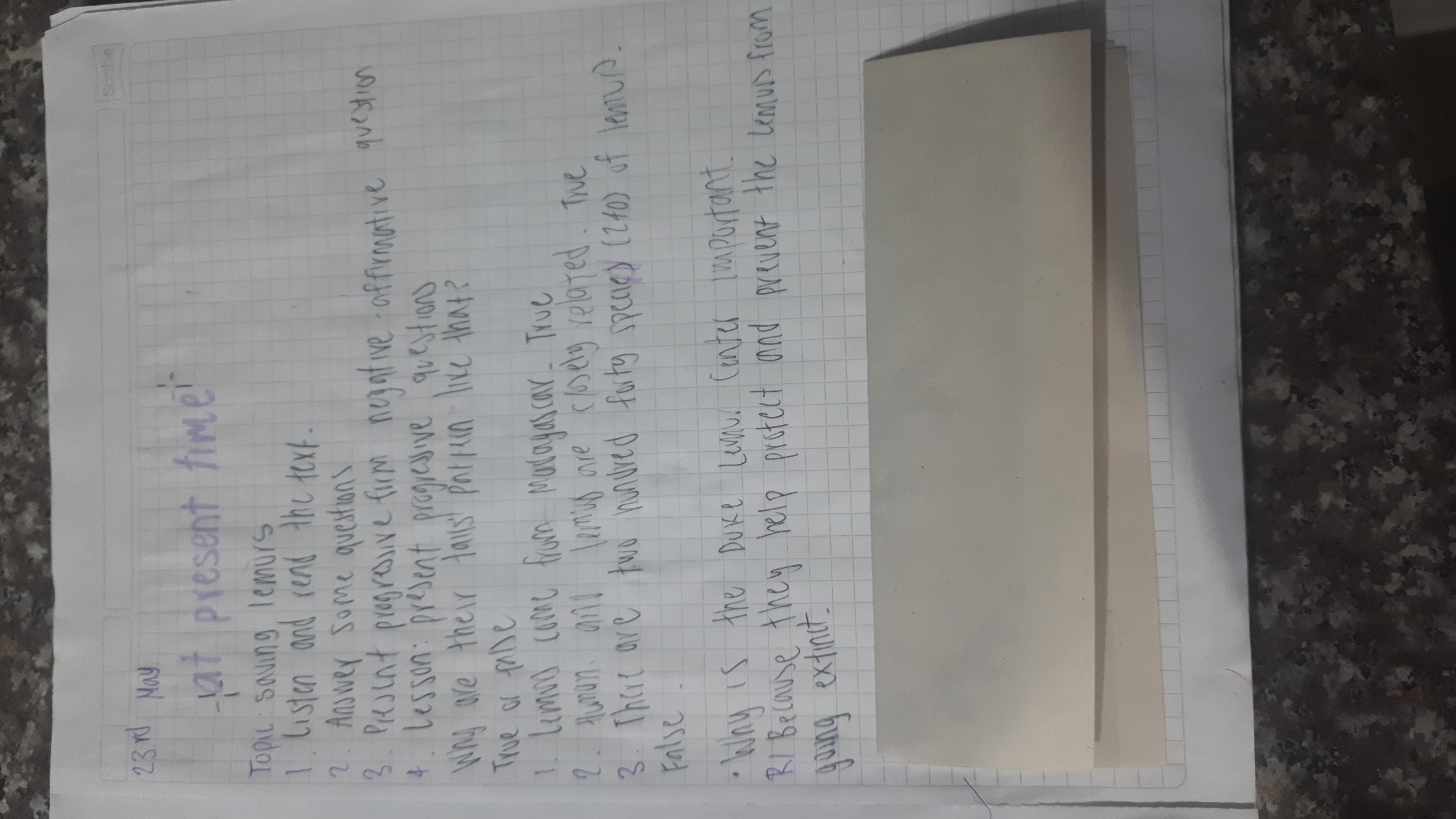 The handwriting exhibits a neat and upright style, with a slight slant to the right. The letter formation is generally clear and rounded, as seen in words like "saving", "lemurs", and "present". The writing is of medium size, filling the lines of the page adequately without appearing cramped or overly spaced. The pressure appears to be consistent, indicating a steady hand. The letter 't' is crossed firmly and the 'i' is dotted accurately.