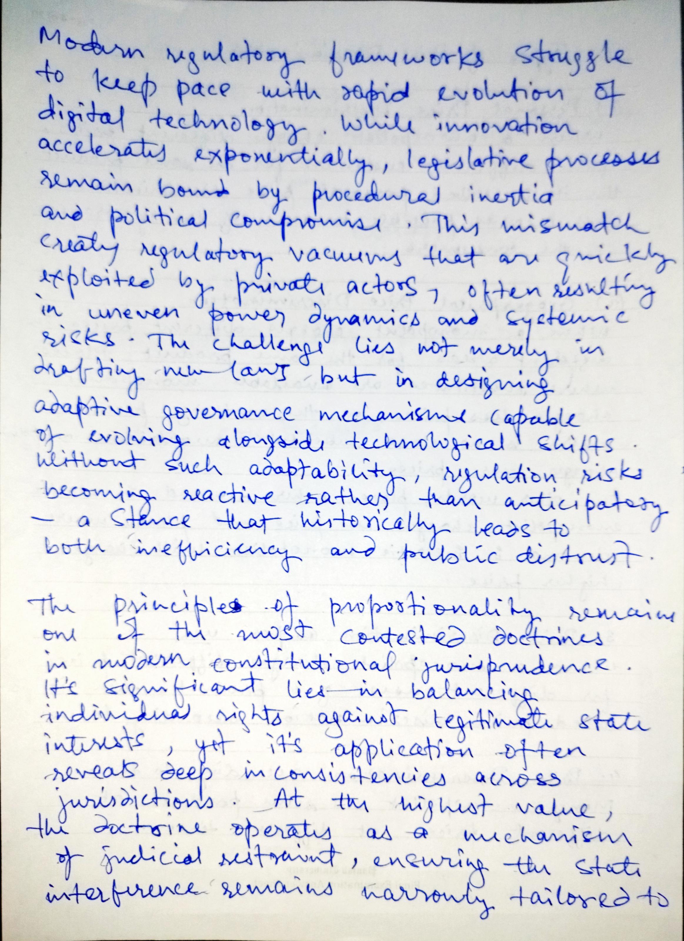 Your handwriting leans towards a connected script, where letters within words often flow seamlessly together, like the 'modern regulatory frameworks' you describe. The letter formation is generally consistent, although there's a slight variation in the size and slant, suggesting a dynamic, rather than rigid, approach. The overall impression is one of deliberate thought and careful execution, yet with a touch of spontaneity, as evidenced by the occasional simplification of letterforms.