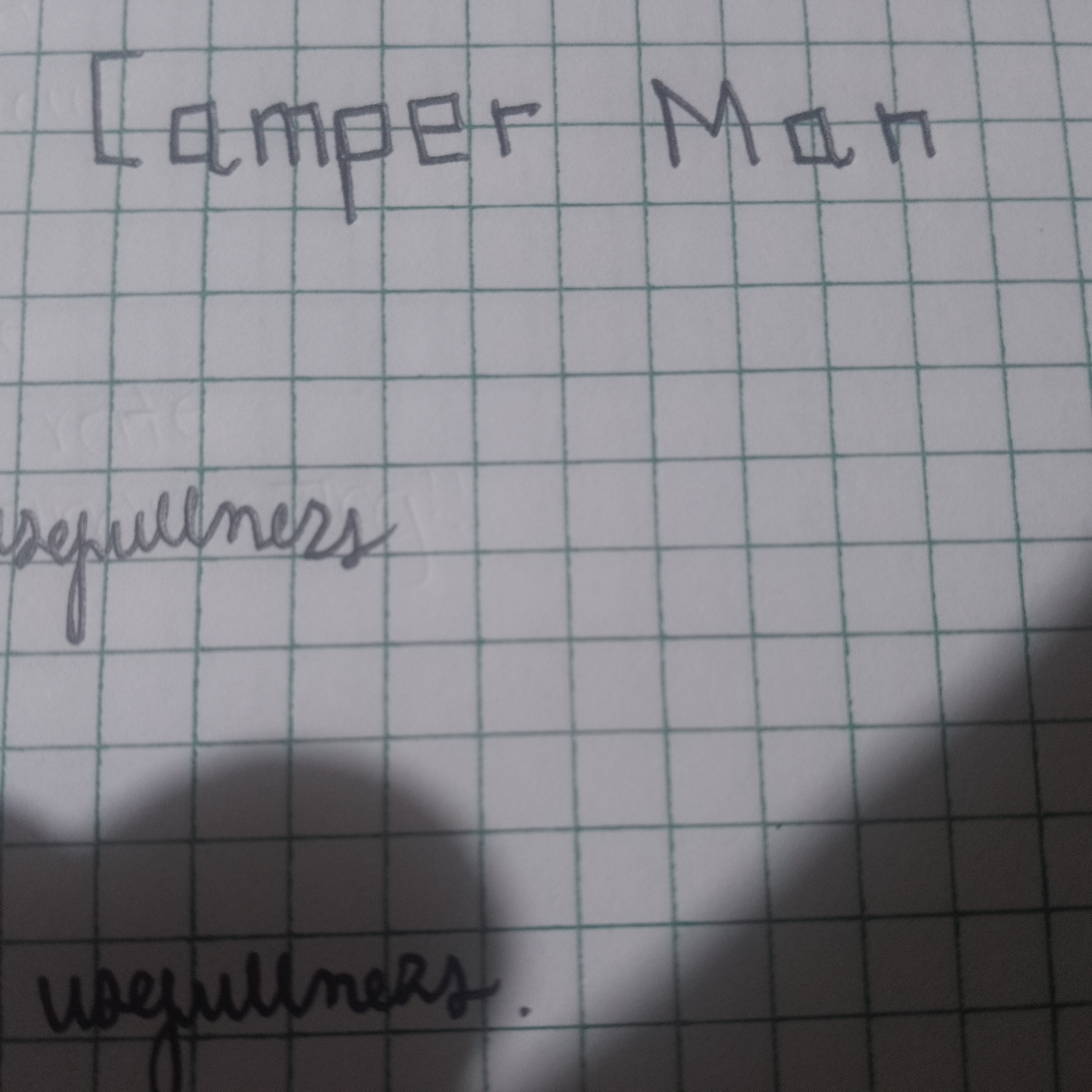 The handwriting presents a dichotomy of styles. The words "Camper Man" are blocky and upright, with clearly defined separate strokes, almost like architectural lettering. This contrasts with the cursive word "usefulness", where letters are connected and flow more freely. The block lettering shows a focus on clarity and distinctness, while the cursive leans towards efficiency and speed. There's a slight forward slant in the cursive, suggesting a degree of enthusiasm.