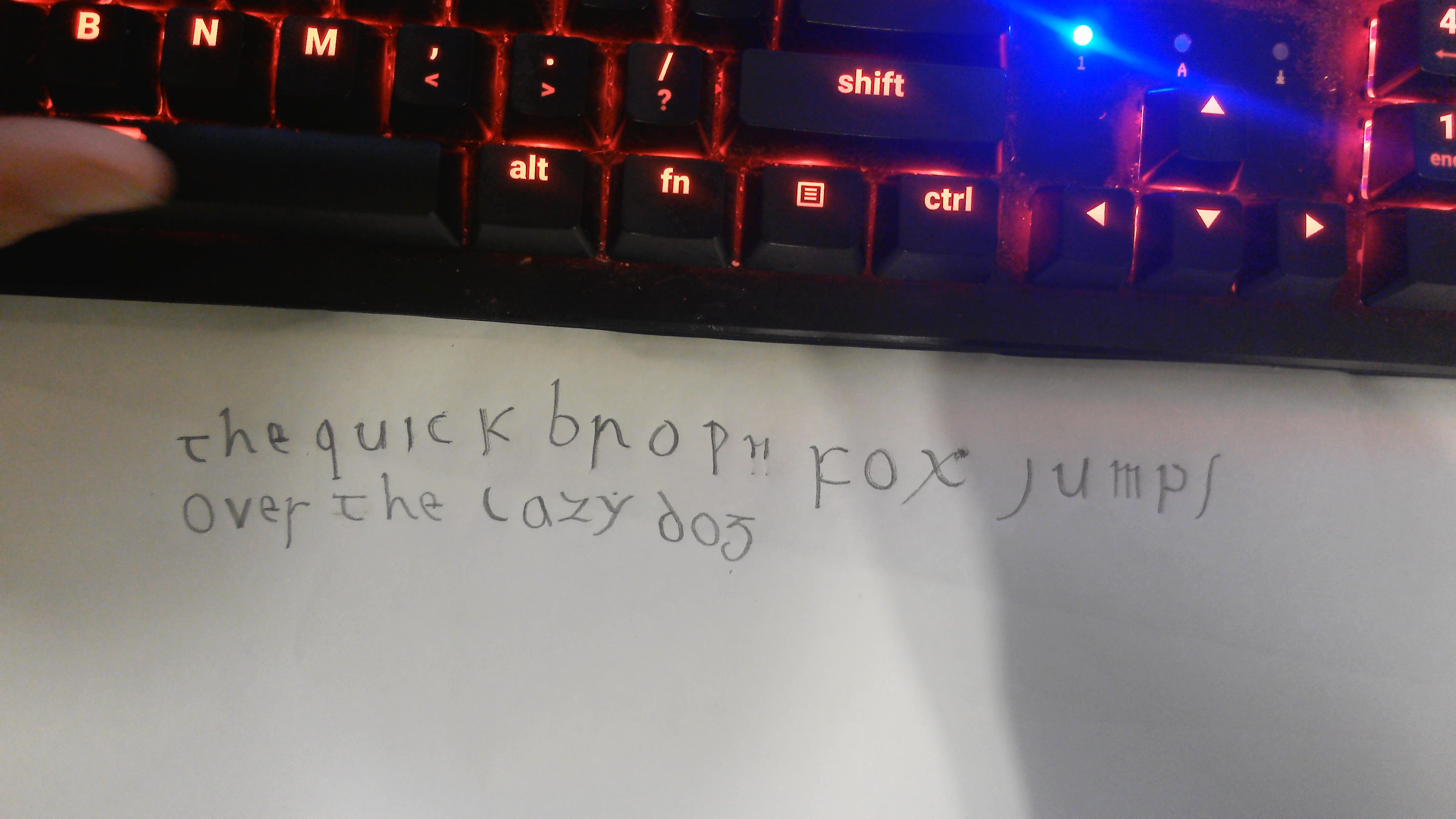 The handwriting presents as somewhat uneven, with varying letter sizes and spacing. The letters themselves lean towards a simplified form, and while some words are easily readable, others like "bropu" require more effort to decipher. There's a general lack of fluidity, as if each letter is constructed independently, giving the overall impression of a practical but not particularly graceful style. The baseline wanders a little, suggesting a degree of restlessness or lack of strict adherence to rules. The pressure applied appears light and consistent. Overall, it's a functional style, prioritizing communication over aesthetics.