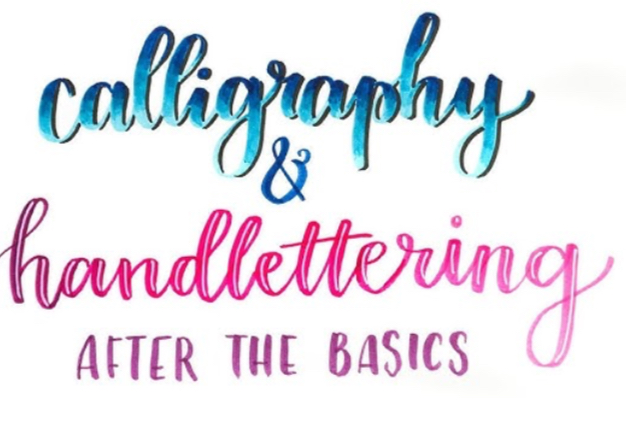 The handwriting sample displays a deliberate and artistic style, reminiscent of calligraphy. The thick and thin strokes in words like "calligraphy" and "handlettering" demonstrate a controlled and varied pressure. The letterforms are elongated and connected with elegant loops, showing a flowing and rhythmic quality. There is evidence of a deliberate attempt at neatness and precision, making it aesthetically pleasing. The consistency is evident across the sample, though it appears more like artistic lettering than spontaneous handwriting.