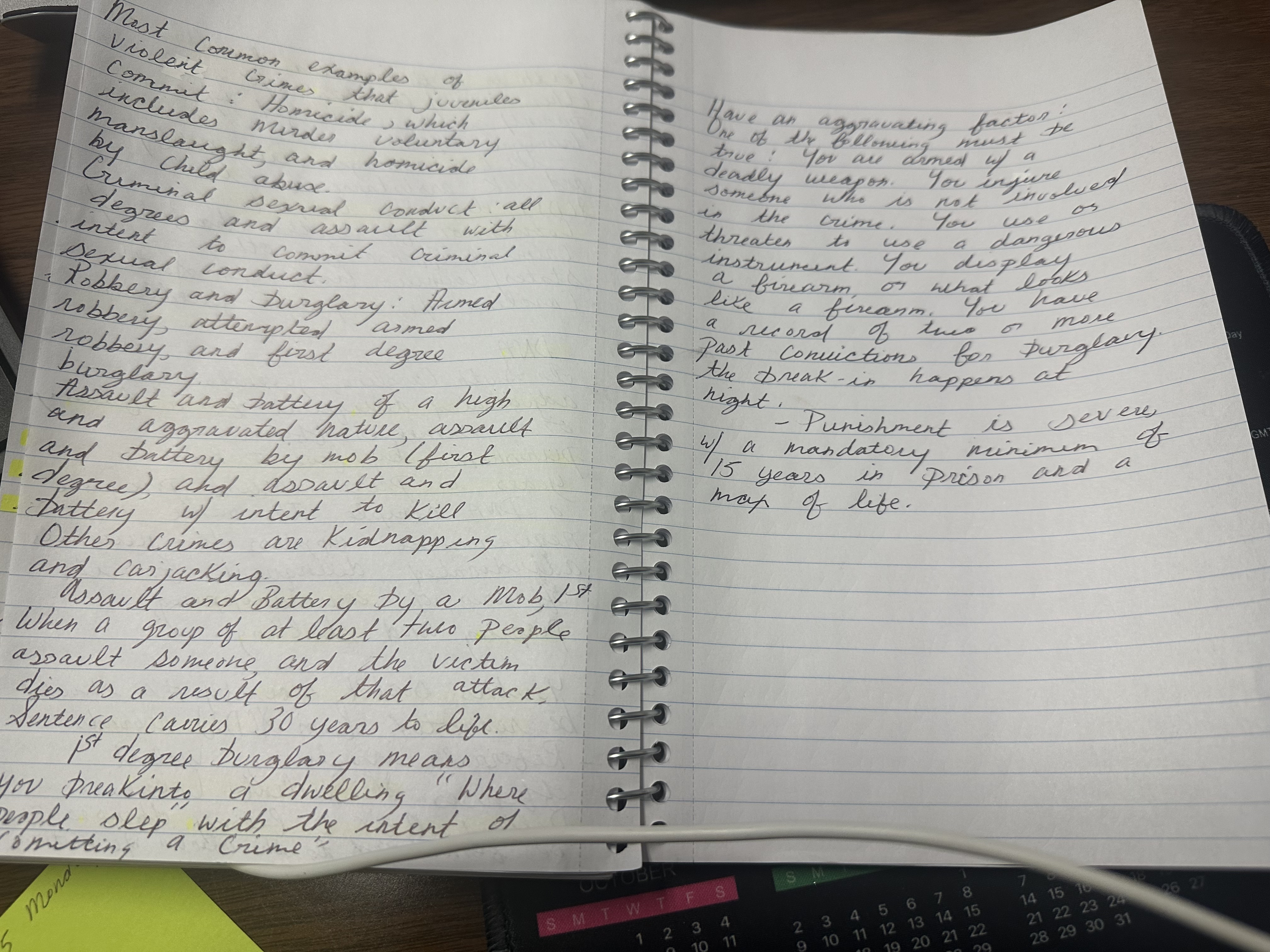 Your handwriting is characterized by a rounded, flowing style, evident in words like "homicide" and "assault." The script has a forward slant, with letters generally well-formed, though occasionally the connections between letters become a little unclear. There's a degree of neatness and organization, helped by writing on lined paper, though the consistency varies; some sections are more compressed than others, such as in the phrase "sexual conduct." The letter size is fairly uniform, contributing to the overall readability.